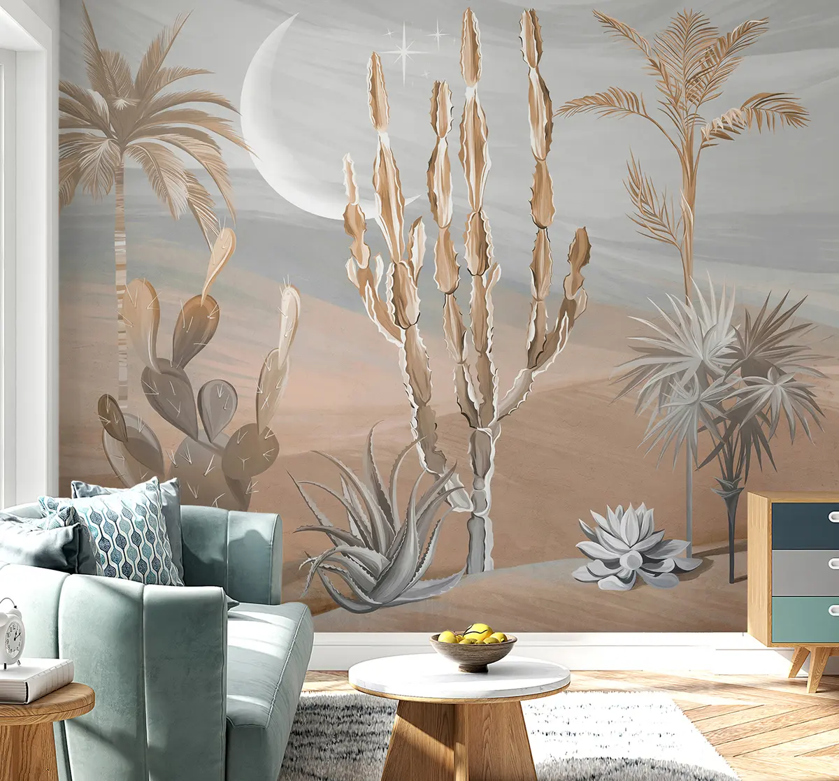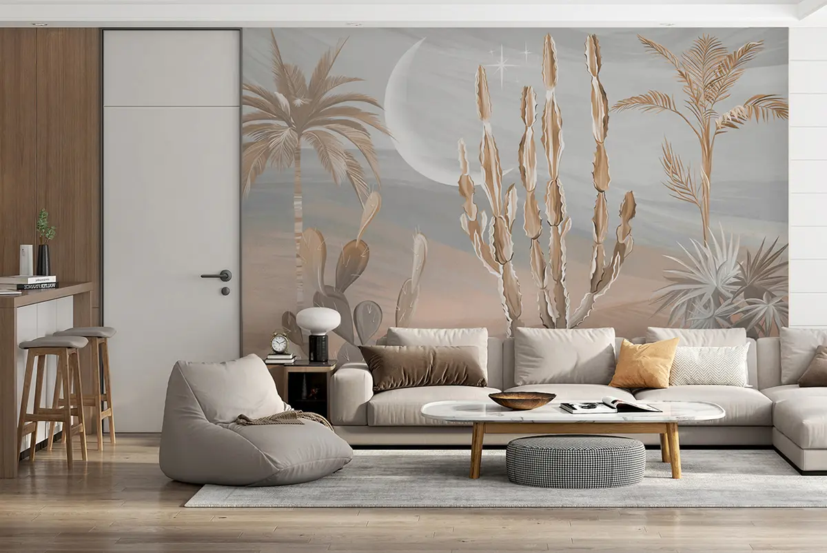 Fototapet 3D-öken med kaktusar och tropiska löv Nr. u96444