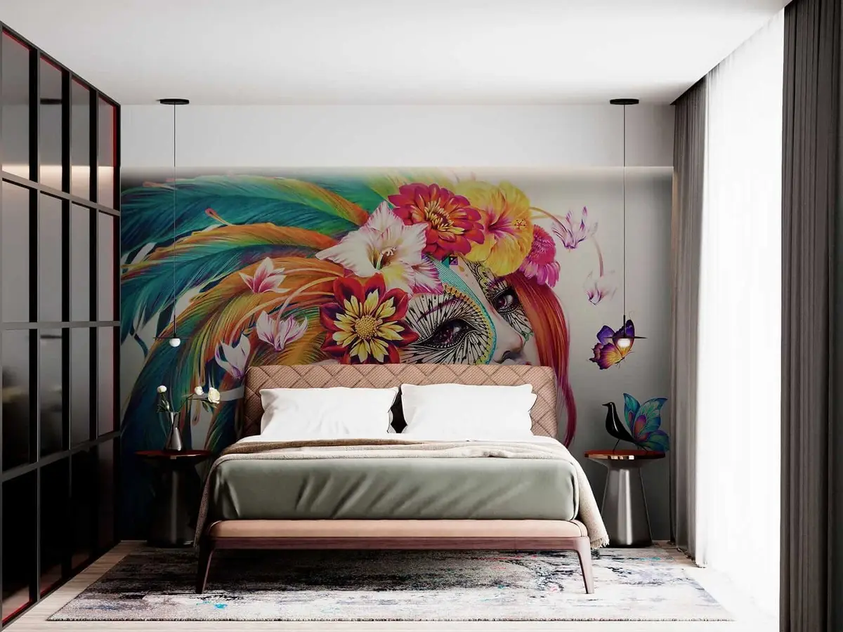 Fototapet Flicka med fjädrar och blommor Nr. u46277