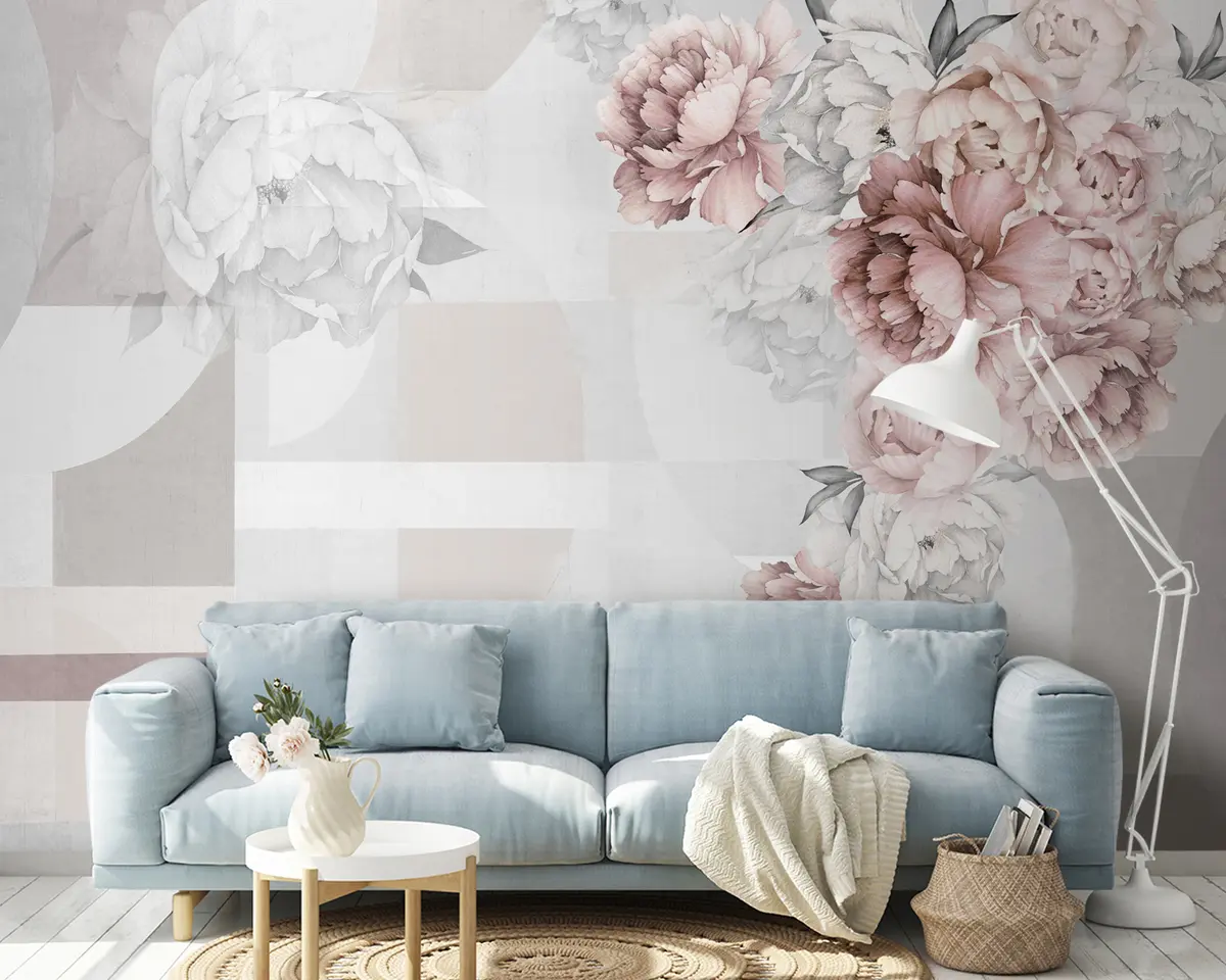 Fototapet Akvarellpioner i rosa färg med geometrisk bakgrund Nr. u95855