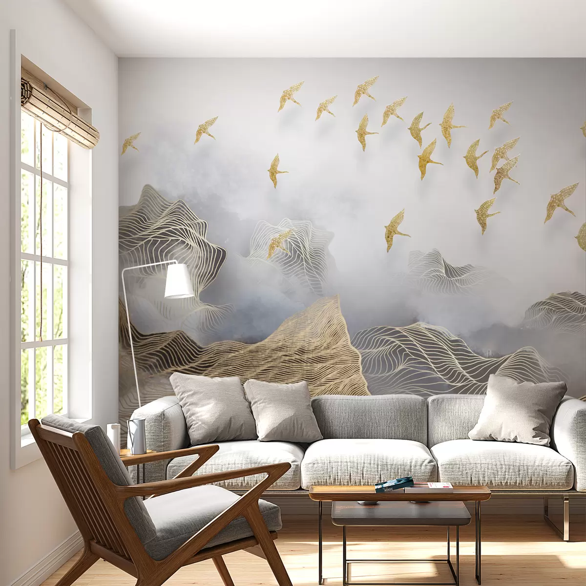 Fototapet Ett underbart landskap med berg och fåglar är ritat av tunna linjer Nr. u44870