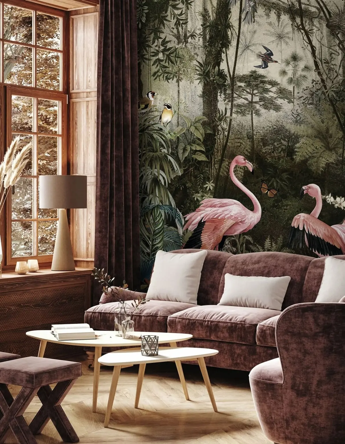 Fototapet Tropiska fåglar och flamingos i djungeln Nr. u73568