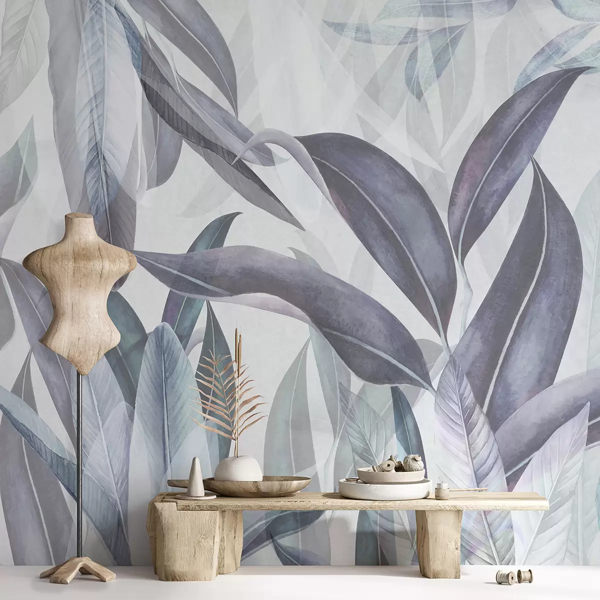 Fototapet Gröna och rosa palmblad i blå färger Nr. u94302v1