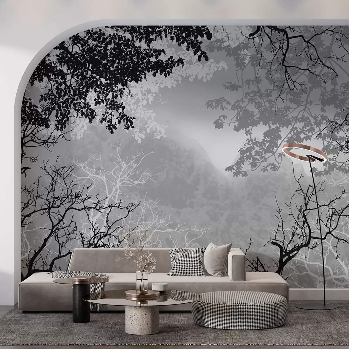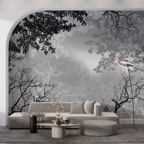 Fototapet Skogsillustration på en bakgrund av berg med dimma Nr. u98050