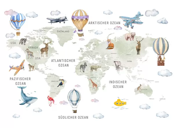 Fototapet Barnkarta i akvarellstil med djur och luftballonger. Tyska språket. Grön färg. Nr. c00001de