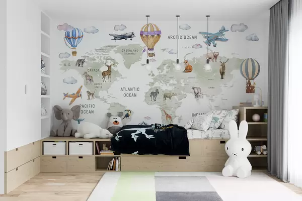 Fototapet Barnkarta i akvarellstil med djur och varmluftsballonger. Engelska språket. Grön färg. Nr. c00001en