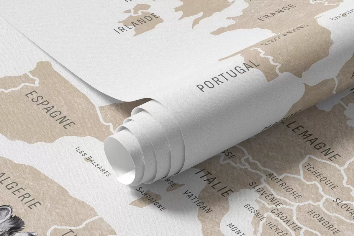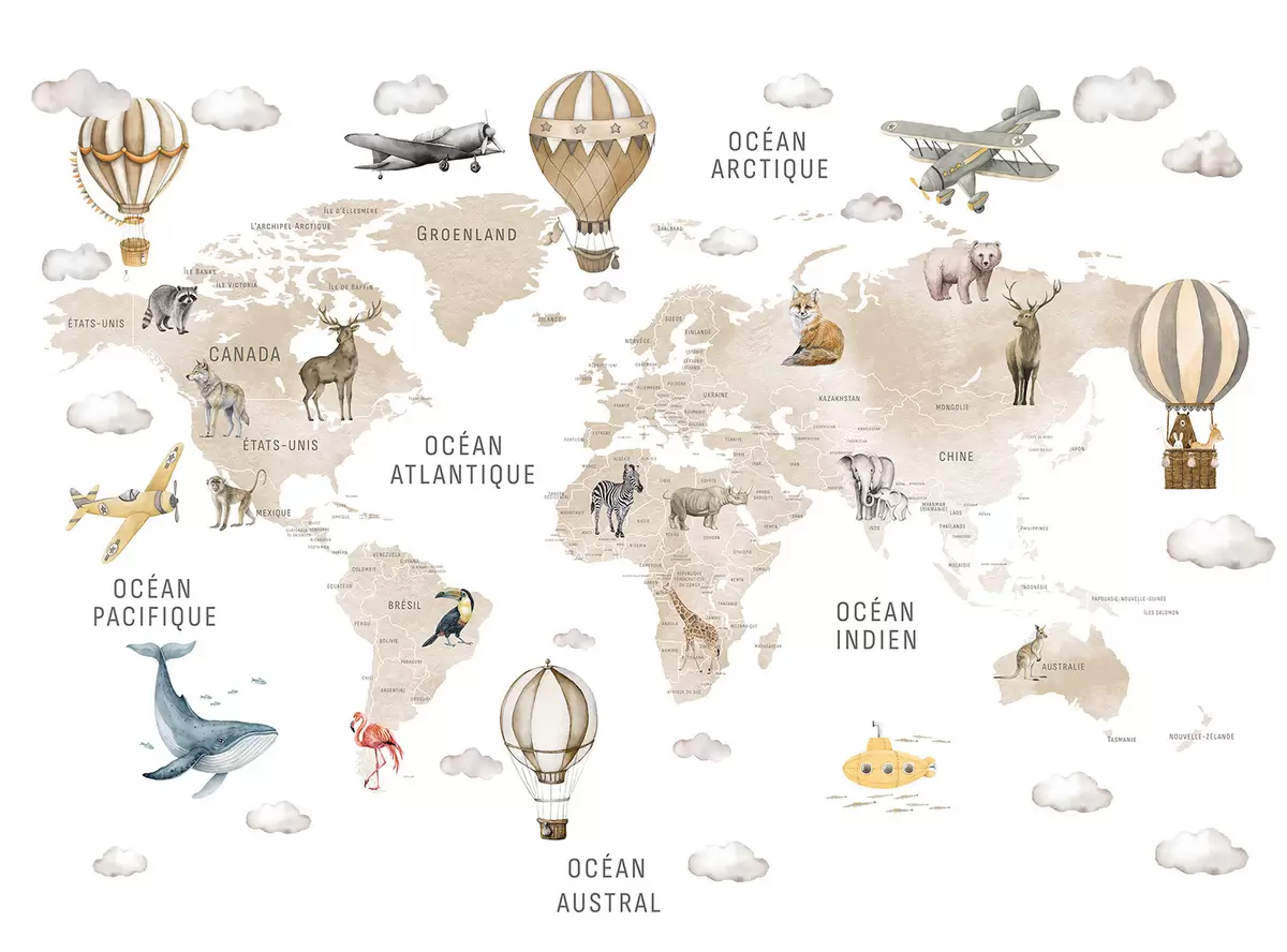 Fototapet Barnkarta i akvarellstil med djur och luftballonger. Franska språket. Beige färg. Nr. c00001frv2