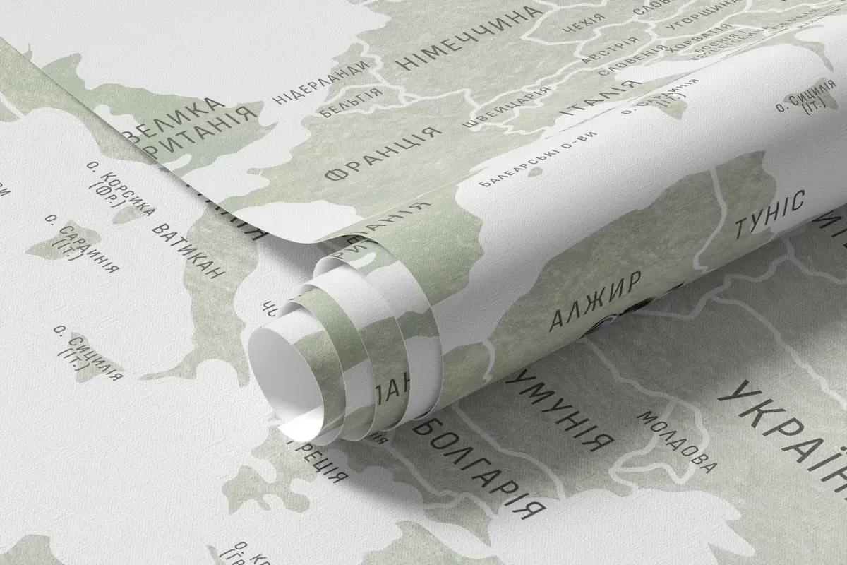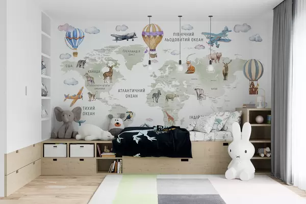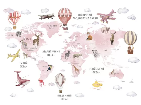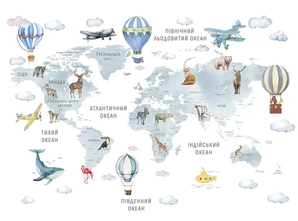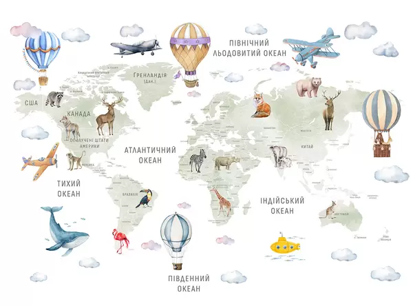 Fototapet Barnkarta i akvarellstil med djur och varmluftsballonger. Ukrainska språket. Grön färg. Nr. c00001uk