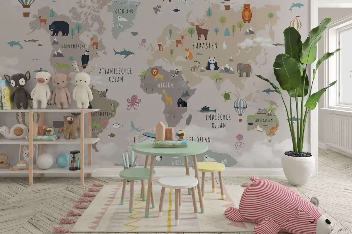 Fototapet Barnens världskarta med djur och varmluftsballonger. Tyska språket Nr. c00002de