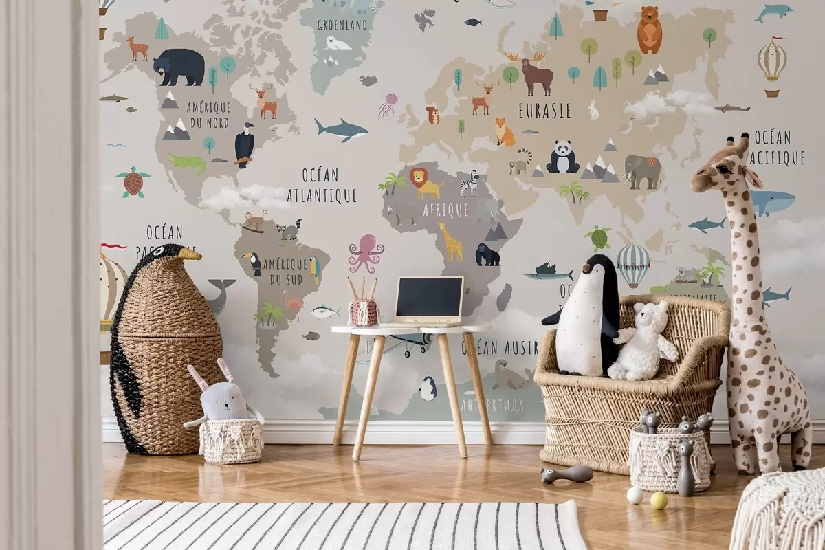 Fototapet Barnens världskarta med djur och varmluftsballonger. Franska språket Nr. c00002fr