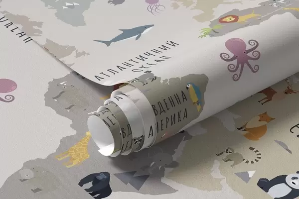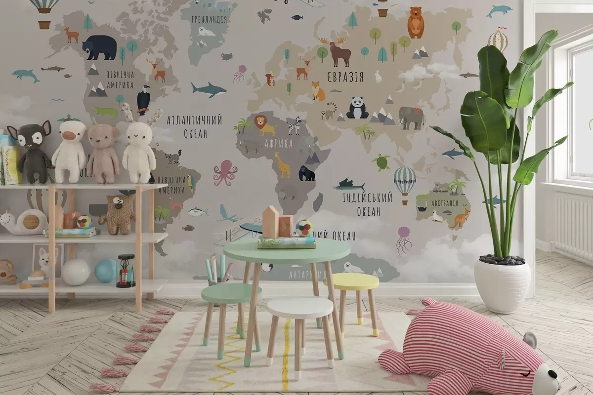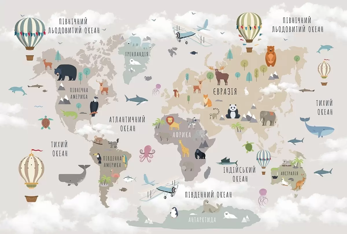 Fototapet Barnens världskarta med djur och varmluftsballonger. Ukrainska språket Nr. c00002uk