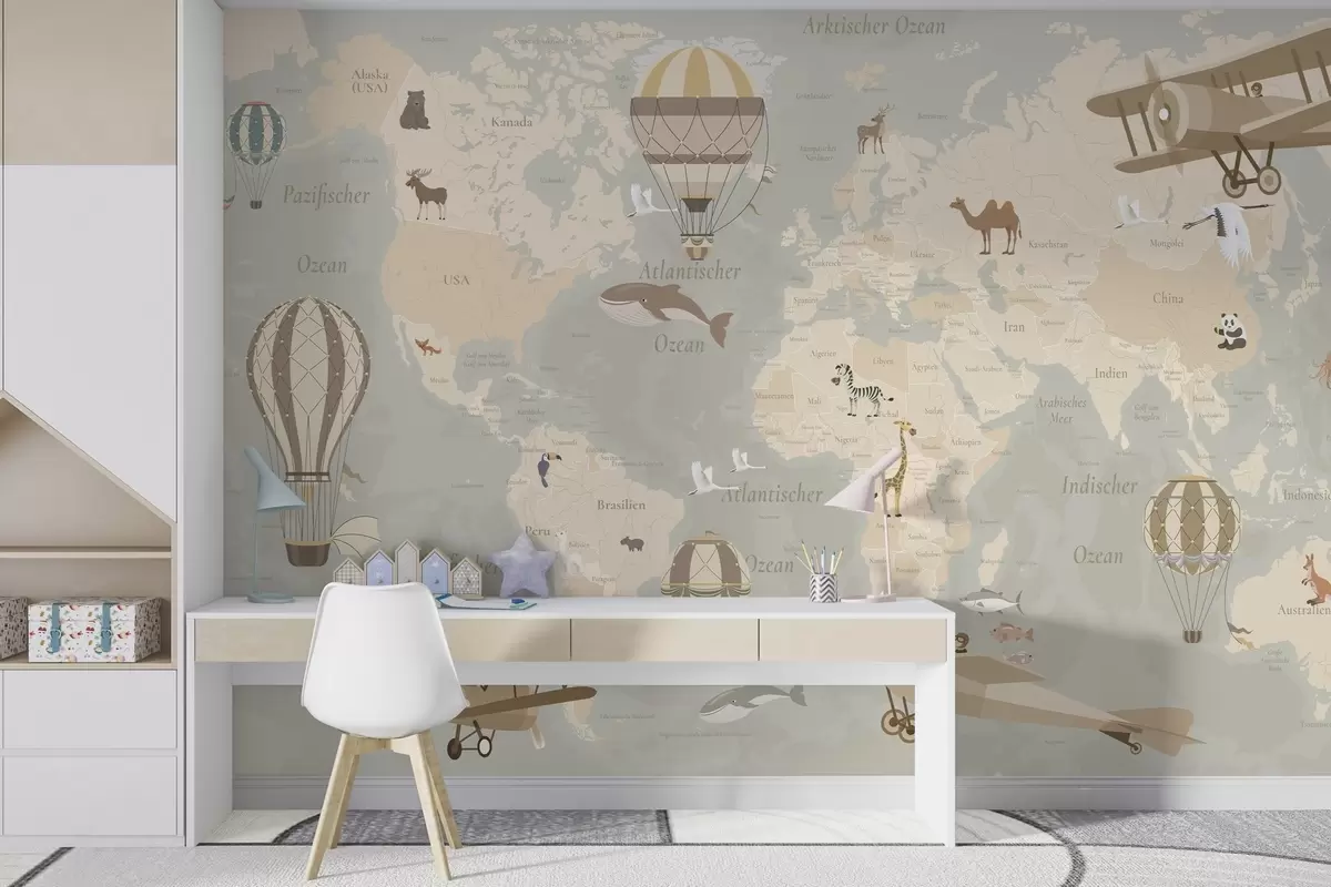 Fototapet Barnens världskarta med djur, flygplan och luftballonger. Tyska språket. Beige färg. Nr. c00003de