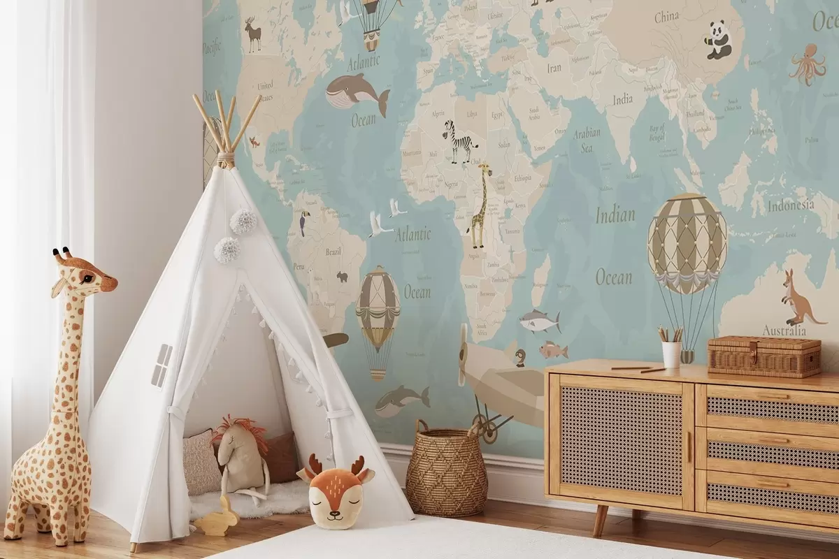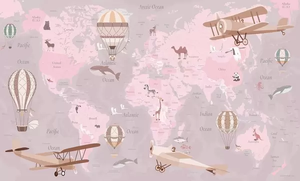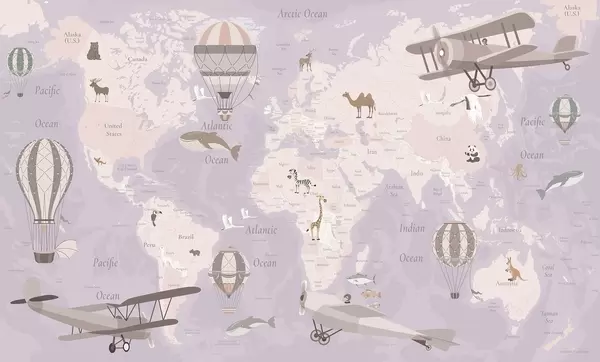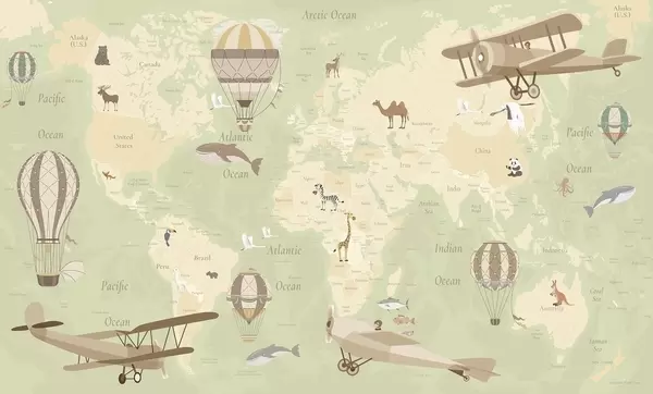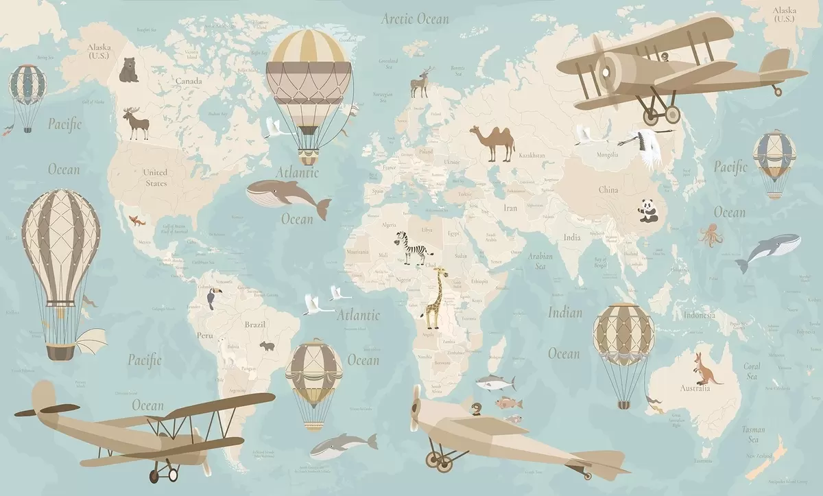 Fototapet Barnens världskarta med djur, flygplan och varmluftsballonger. Engelska språket. Blå färg. Nr. c00003env1