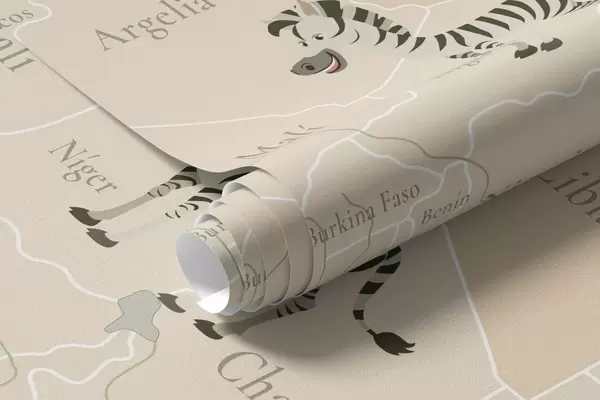 Fototapet Barnens världskarta med djur, flygplan och varmluftsballonger. Spanska språket. Beige färg. Nr. c00003es