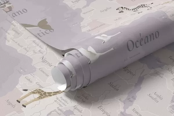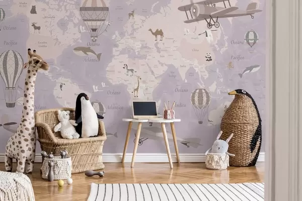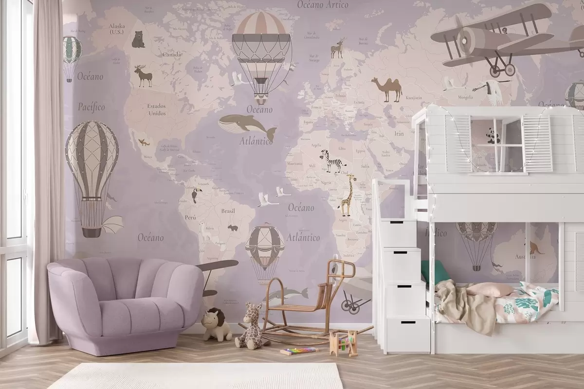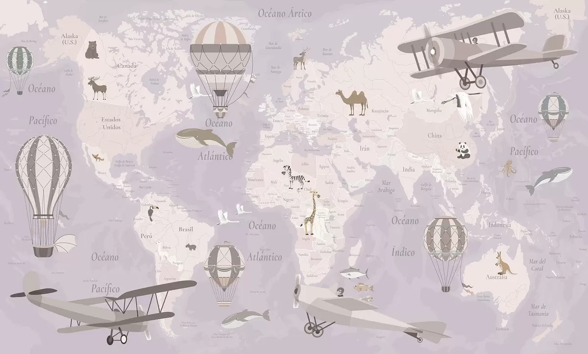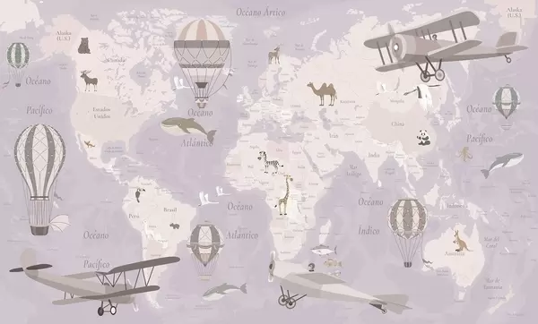 Fototapet Barnens världskarta med djur, flygplan och luftballonger. Spanska språket. Lila färg. Nr. c00003esv4