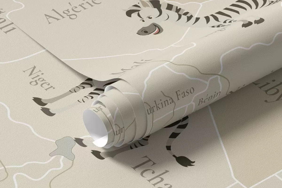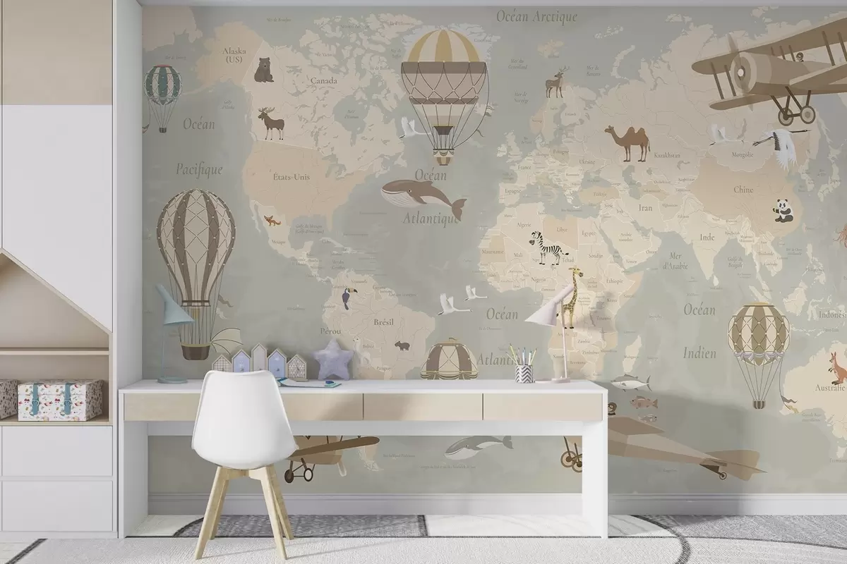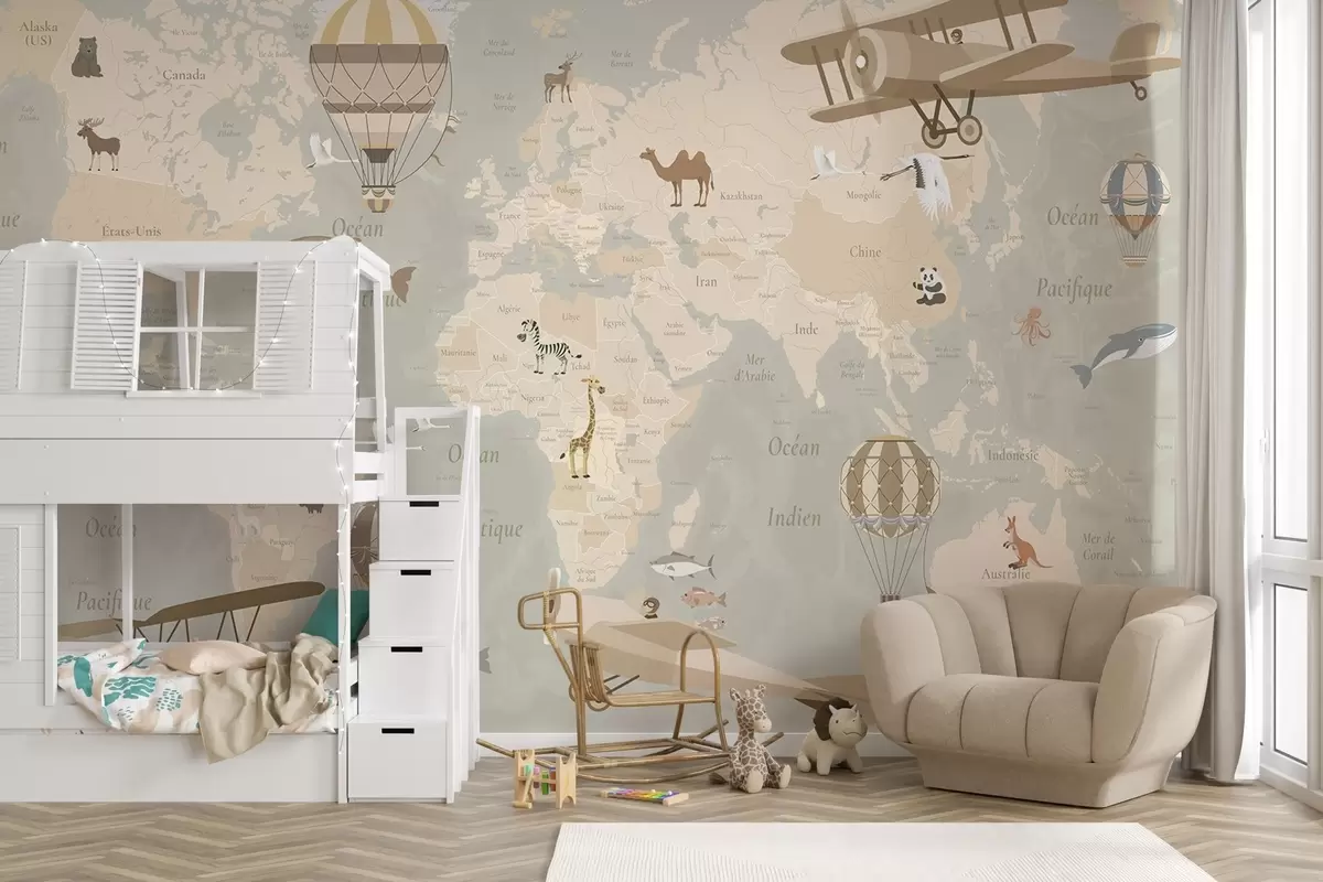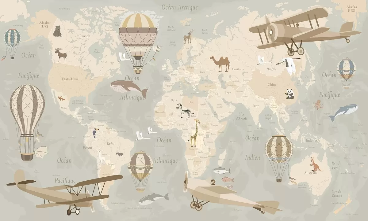 Fototapet Barnens världskarta med djur, flygplan och luftballonger. Franska språket. Beige färg. Nr. c00003fr