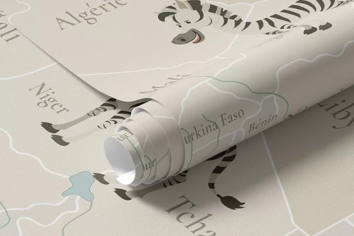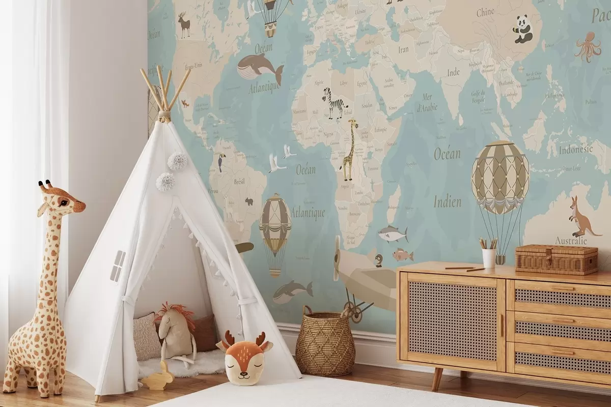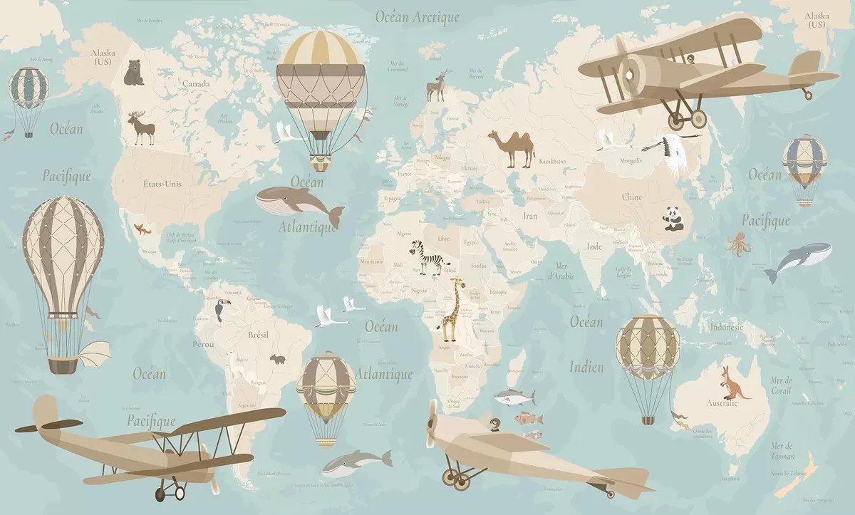 Fototapet Barnens världskarta med djur, flygplan och varmluftsballonger. Franska språket. Blå färg. Nr. c00003frv1