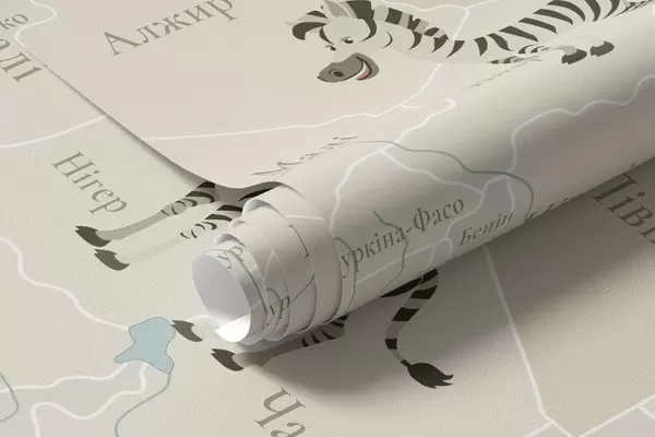 Fototapet Barnens världskarta med djur, flygplan och varmluftsballonger. Ukrainska språket. Blå färg. Nr. c00003ukv1