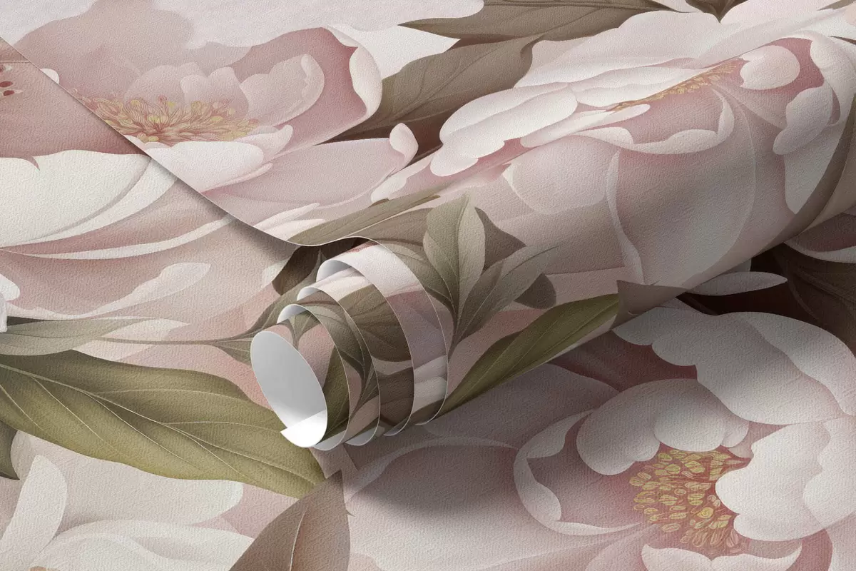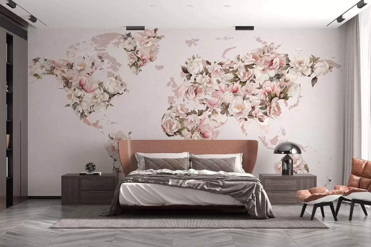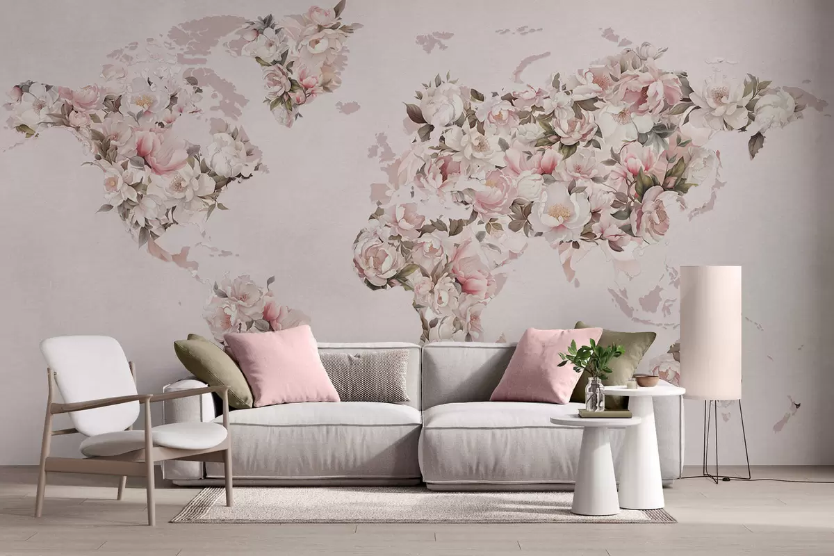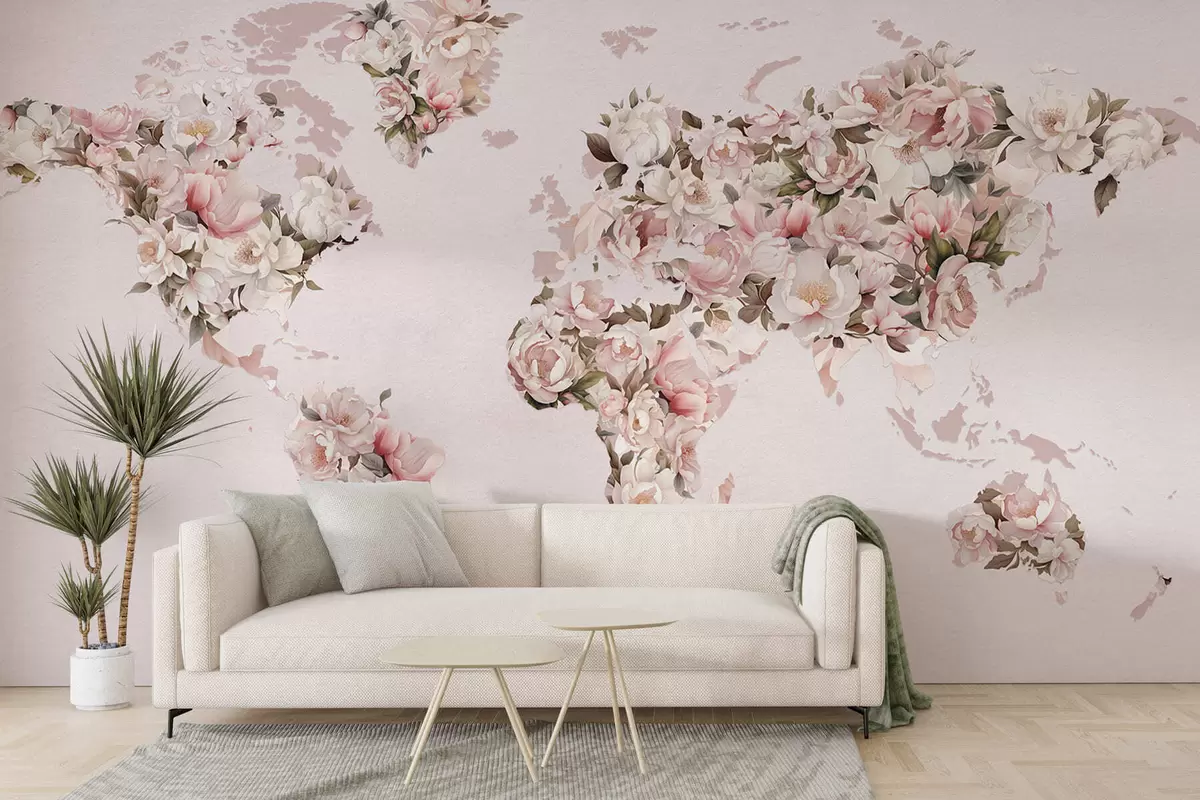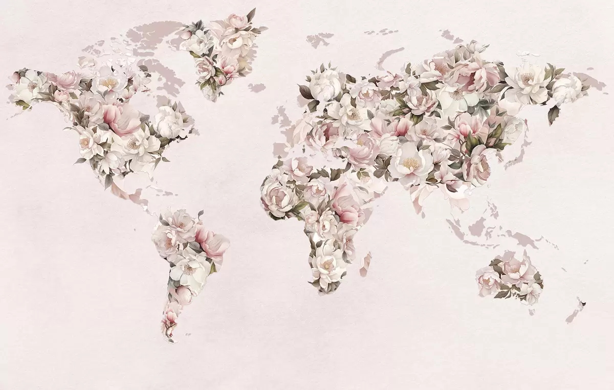 Fototapet En rosa världskarta gjord av stora vita och rosa pioner Nr. c00005
