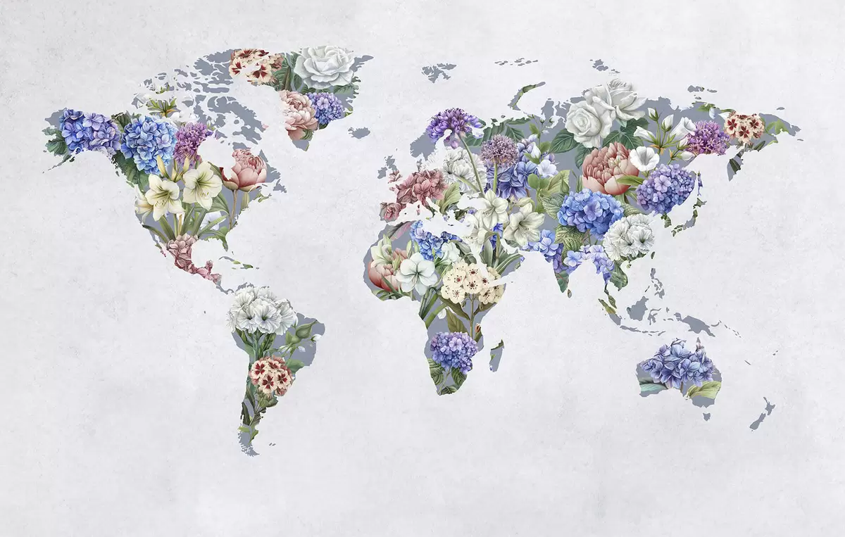 Fototapet En färgglad världskarta gjord av en mängd olika färgglada blommor Nr. c00006