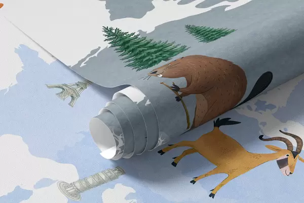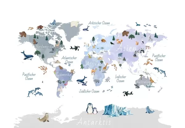 Fototapet En blå karta i akvarellstil med djur, växter och arkitektur. Text på tyska Nr. c00009dev1