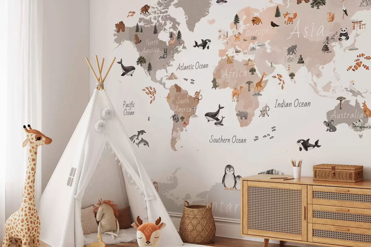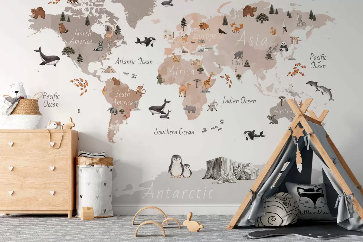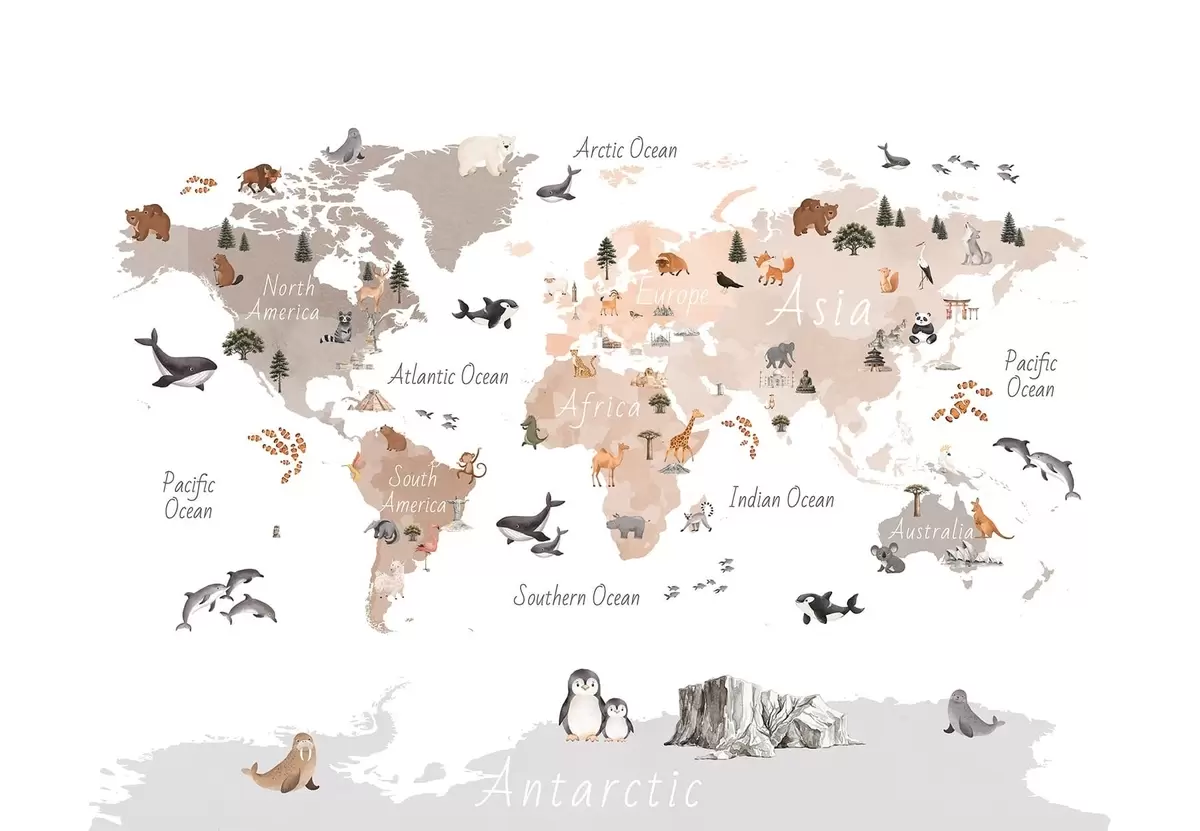 Fototapet En karta i akvarellstil i beige med motiv av djur, växter och arkitektur. Text på engelska Nr. c00009env3