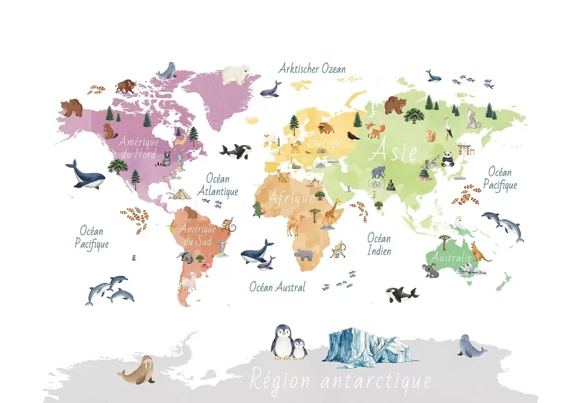 Fototapet En färgkartor i akvarellstil med djur, växter och arkitektur. Text på franska Nr. c00009fr