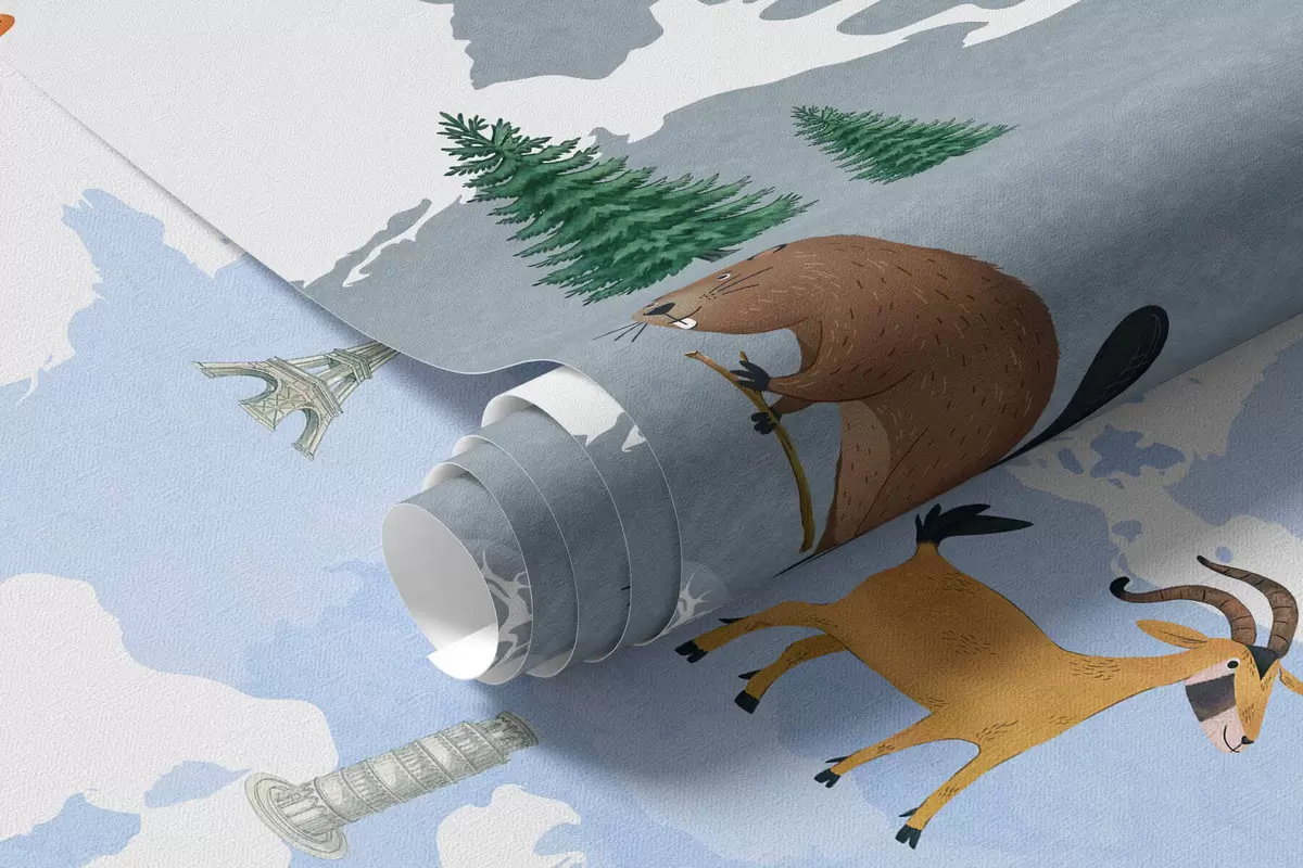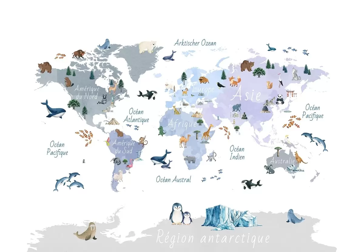 Fototapet En blå karta i akvarellstil med djur, växter och arkitektur. Text på franska Nr. c00009frv1