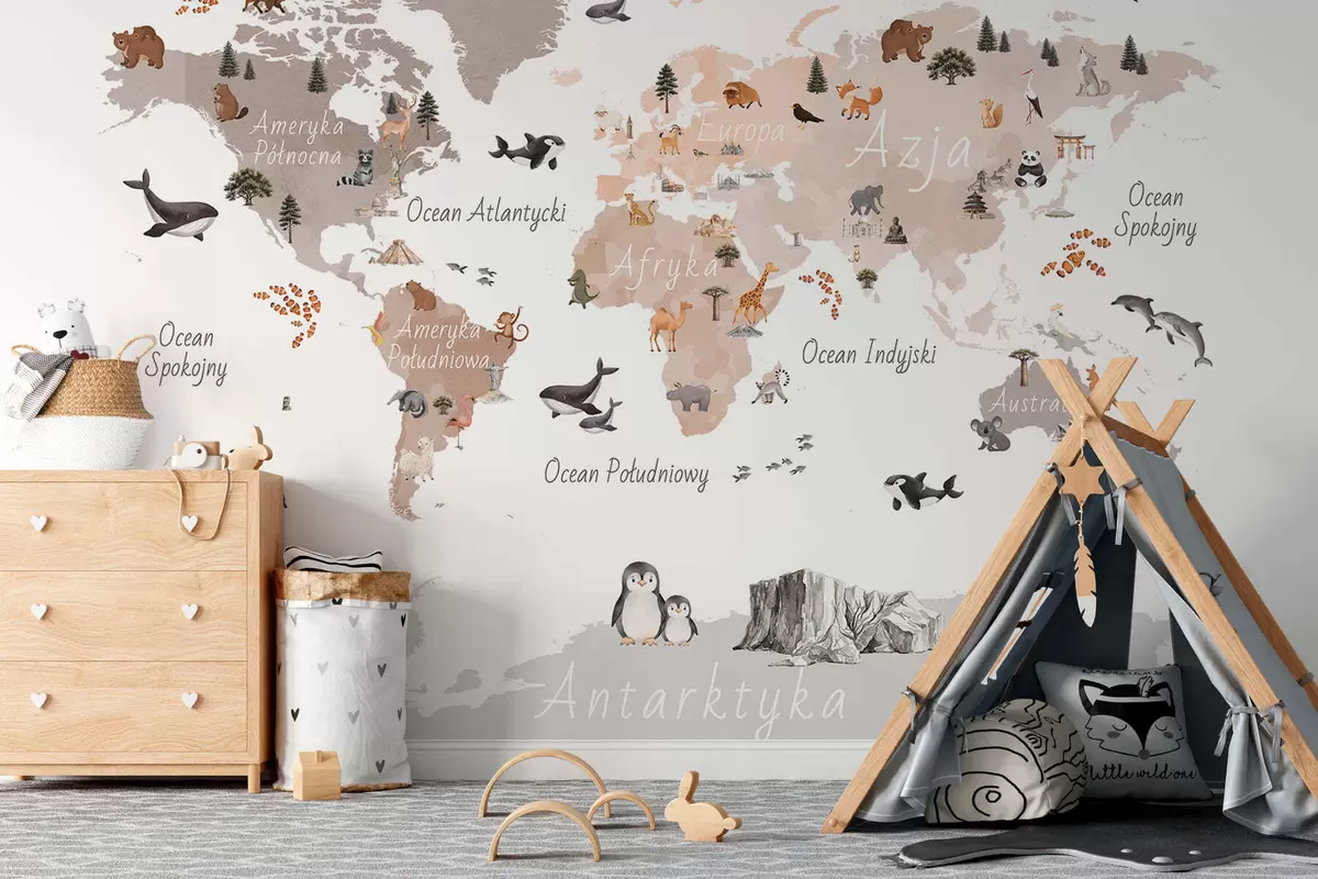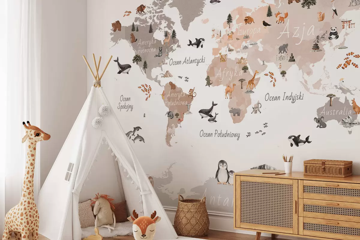 Fototapet En karta i akvarellstil i beige med motiv av djur, växter och arkitektur. Text på polska Nr. c00009plv3