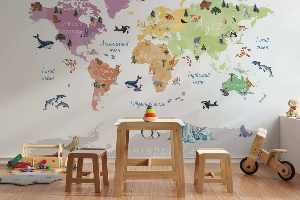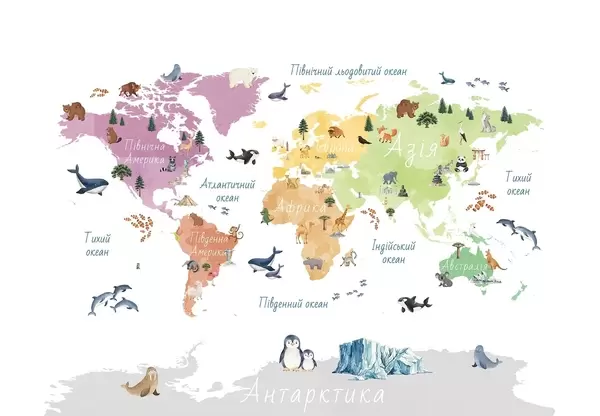 Fototapet En färgkartor i akvarellstil med djur, växter och arkitektur. Bildtexter på ukrainska Nr. c00009uk
