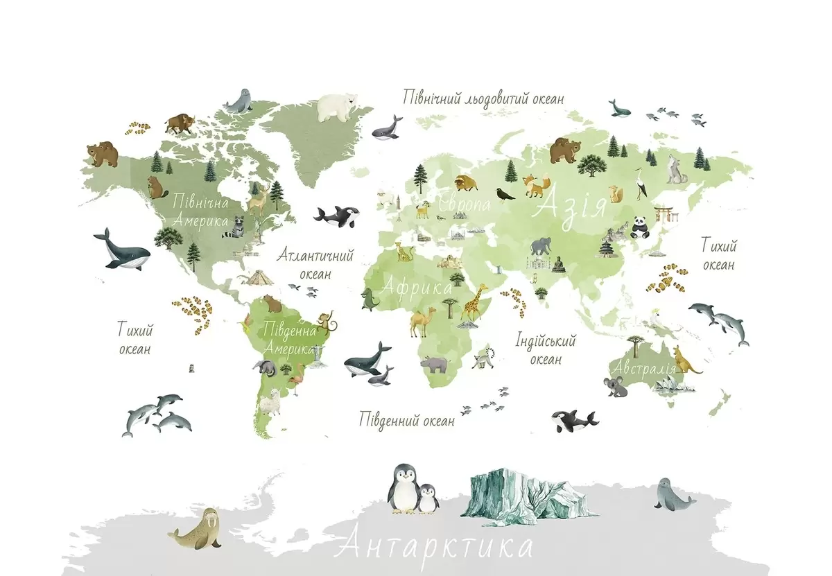 Fototapet En grön karta i akvarellstil med djur, växter och arkitektur. Bildtexter på ukrainska Nr. c00009ukv2