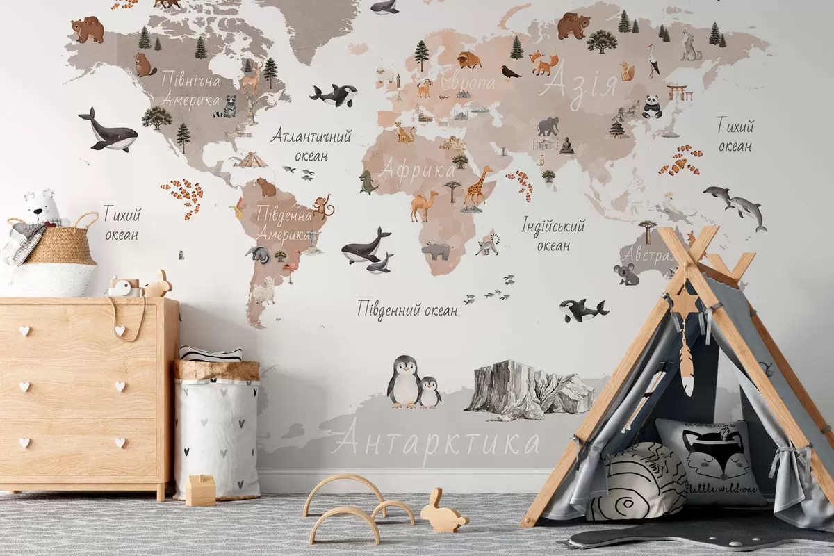 Fototapet En karta i akvarellstil i beige med motiv av djur, växter och arkitektur. Text på ukrainska Nr. c00009ukv3