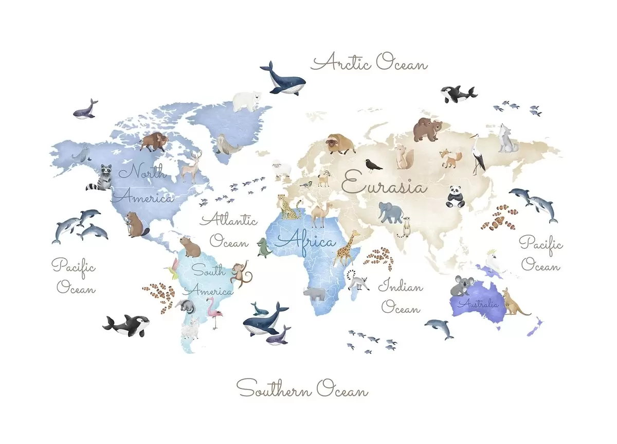 Fototapet En blå karta i akvarellstil med djur. Etiketter på engelska Nr. c00012env1