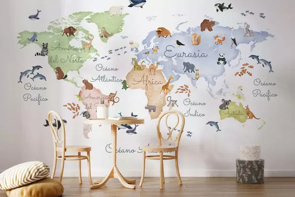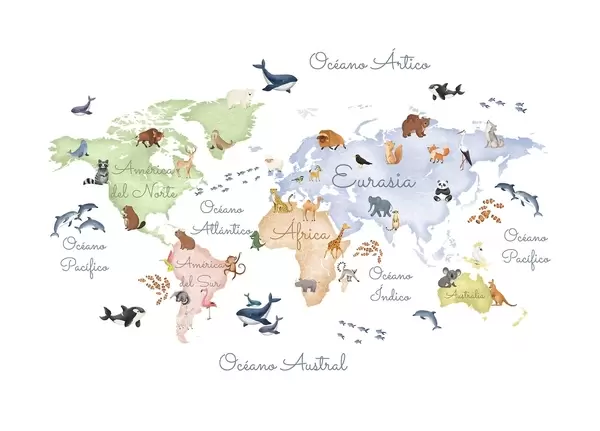 Fototapet En färgkartor i akvarellstil med djur. Bildtexter på spanska Nr. c00012es