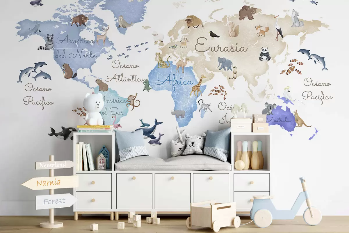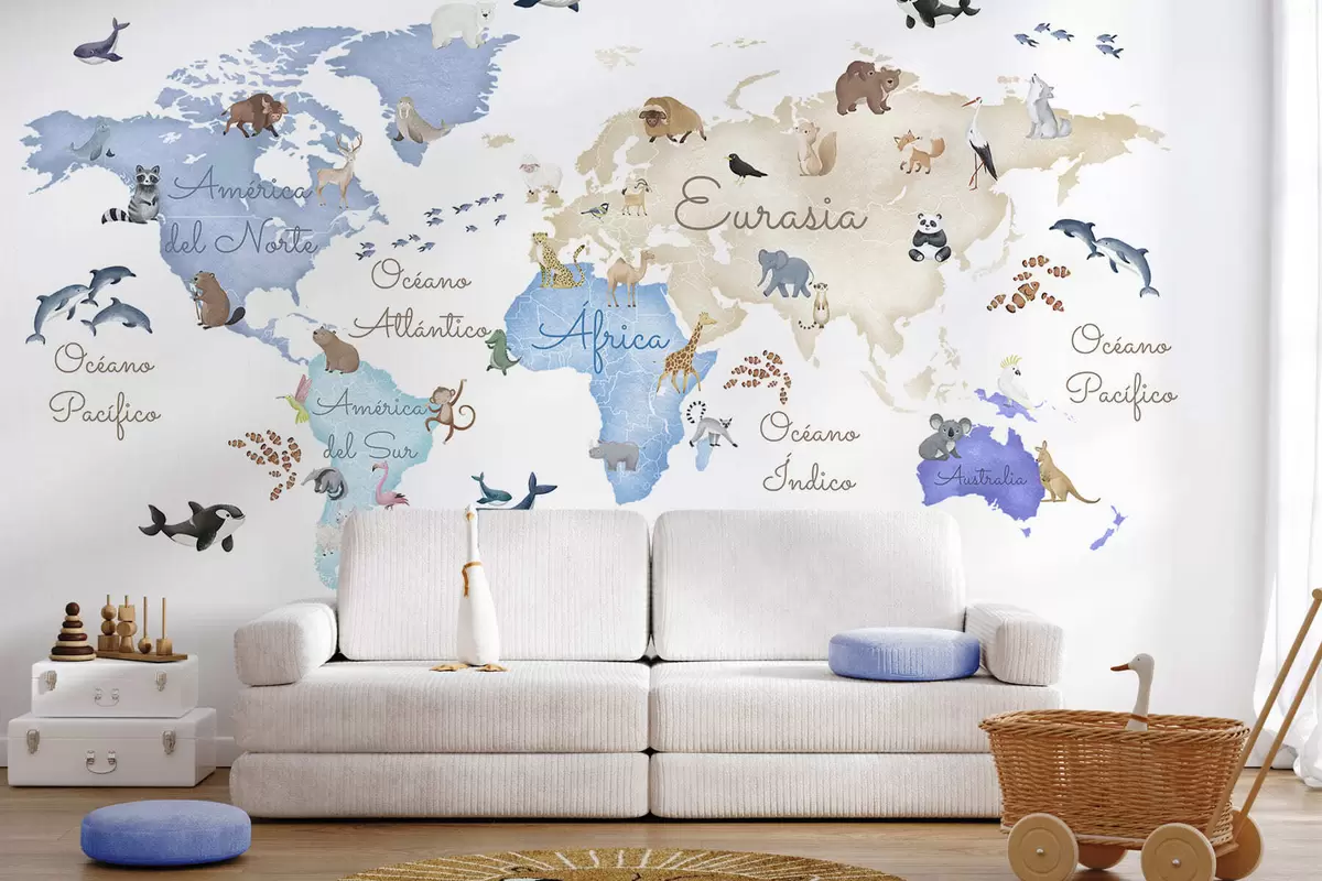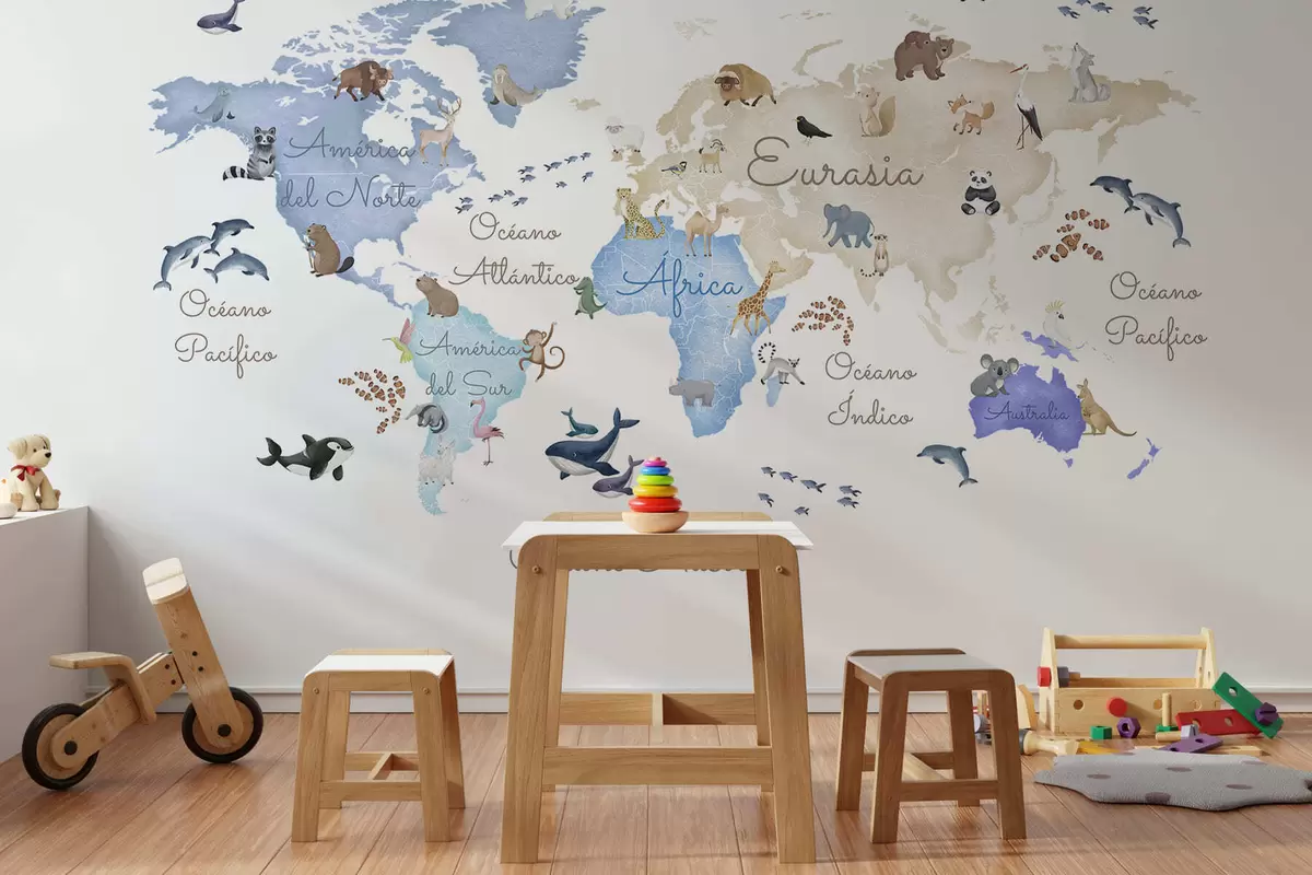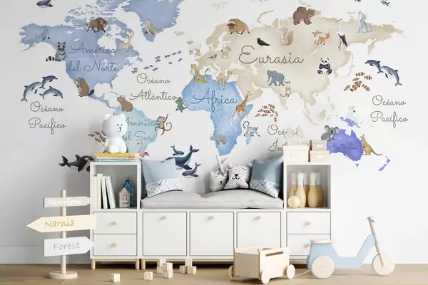 Fototapet En blå karta i akvarellstil med djur. Text på spanska Nr. c00012esv1