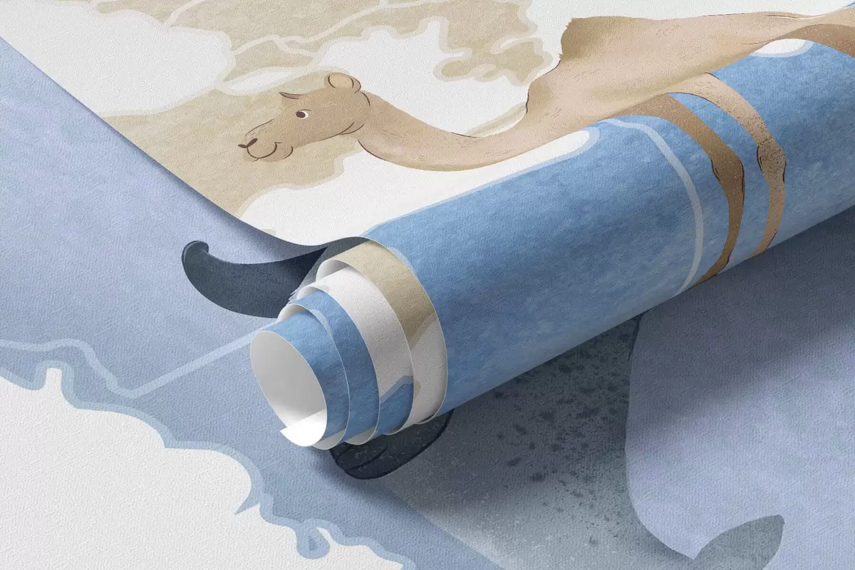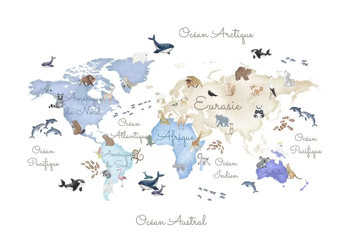 Fototapet En blå karta i akvarellstil med djur. Text på franska Nr. c00012frv1