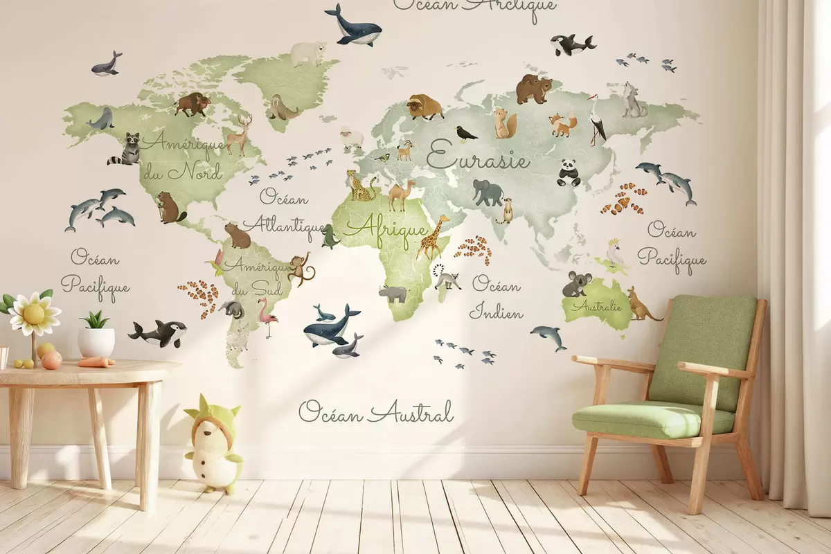 Fototapet En grön karta i akvarellstil med djur. Text på franska Nr. c00012frv2