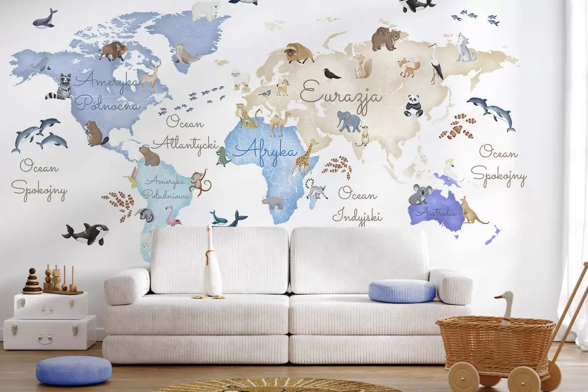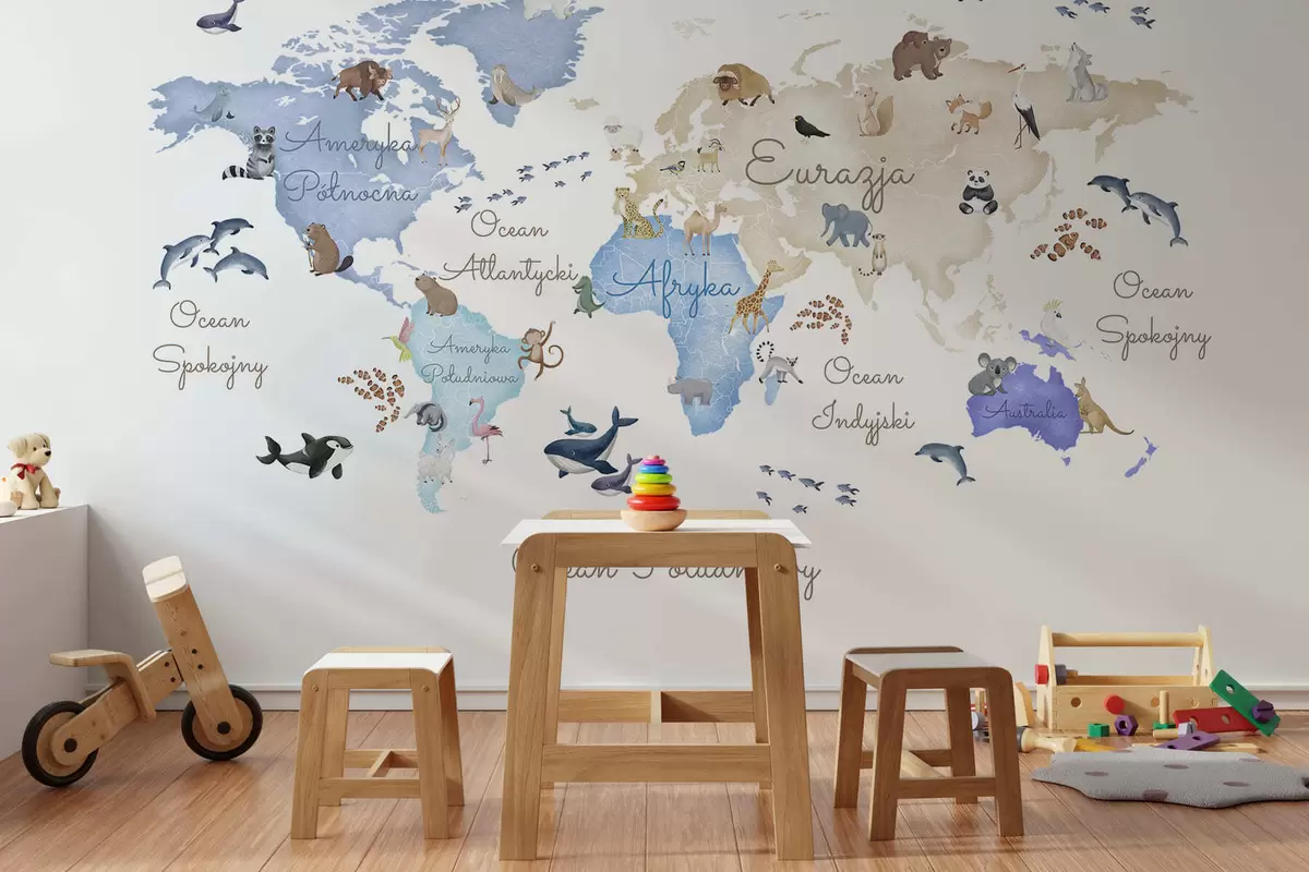 Fototapet En blå karta i akvarellstil med djur. Text på polska Nr. c00012plv1