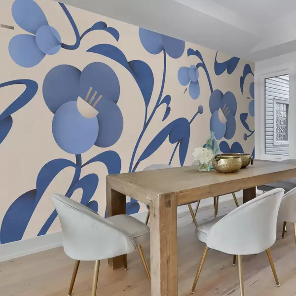 Fototapet Botaniskt tryck med dekorativa blå blommor mot en beige bakgrund Nr. u99196v7