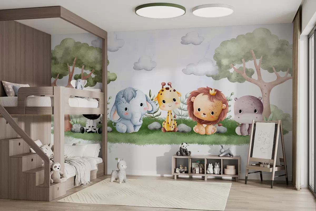 Fototapet En grupp söta tecknade djur som sitter på ett gräsbevuxet fält med träd och moln i bakgrunden Nr. w00705