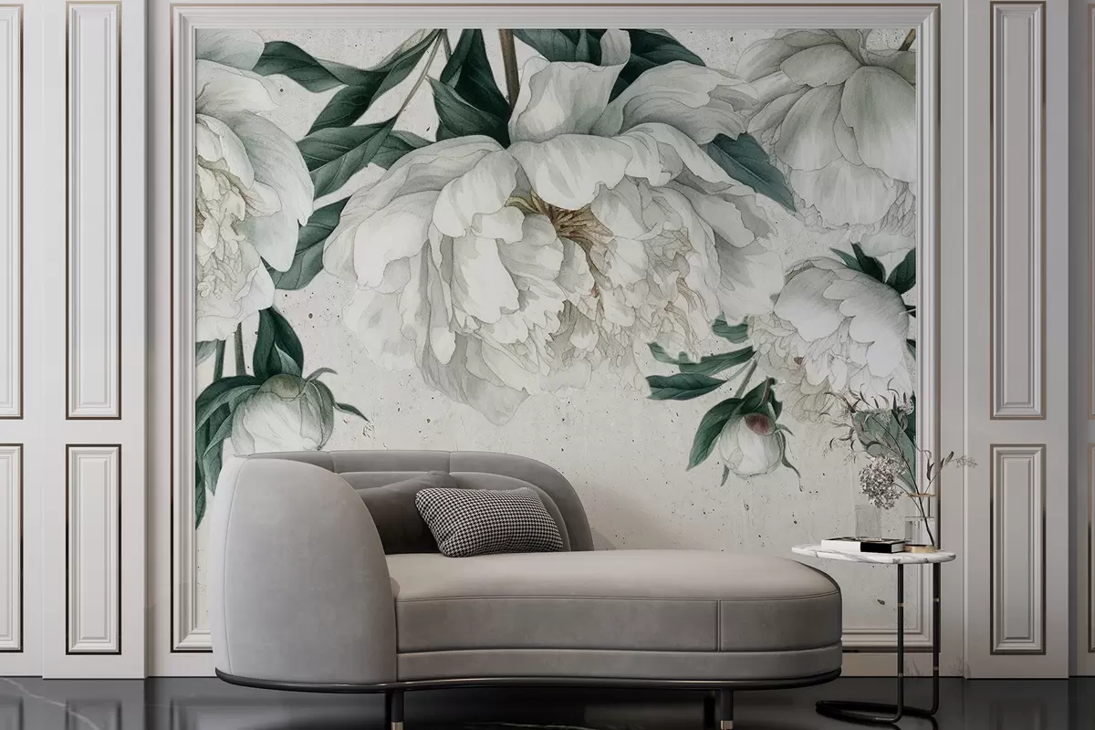 Fototapet Vita stora pioner med gröna blad på en ljus strukturerad bakgrund Nr. w00837