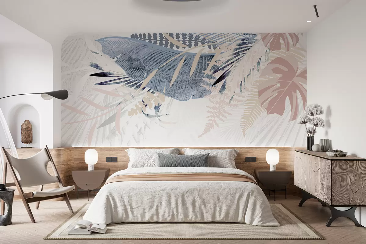 Fototapet Modern botanisk design med tropiskt texturerat palmbladsmönster med olika nyanser av blått, grått och rosa Nr. w00908