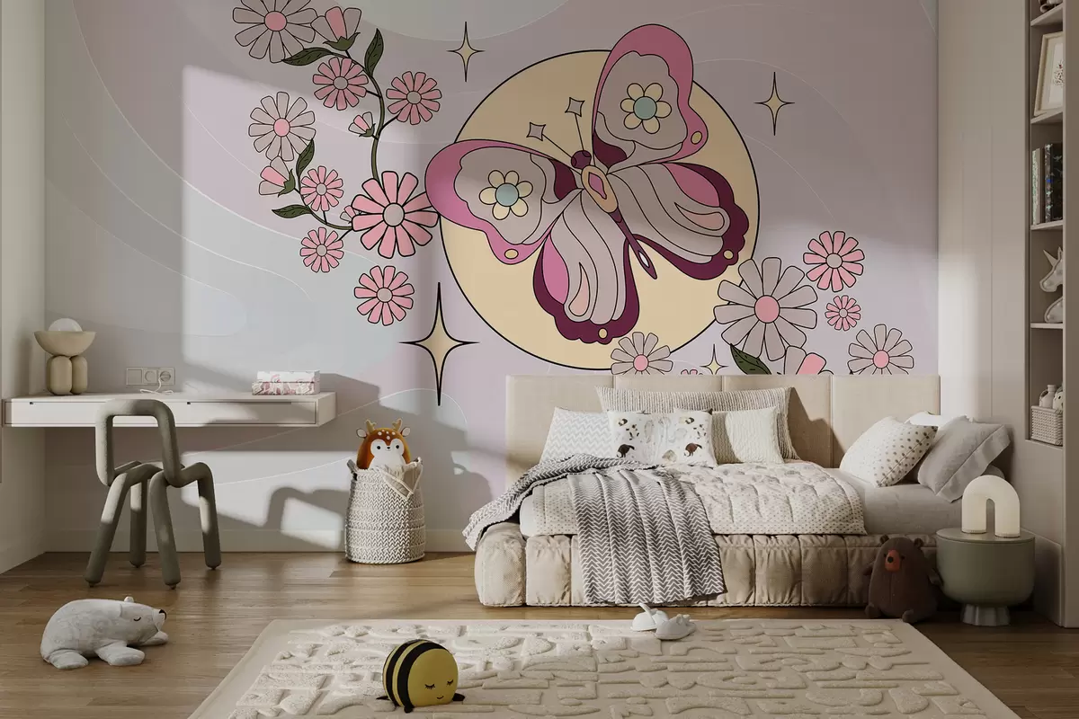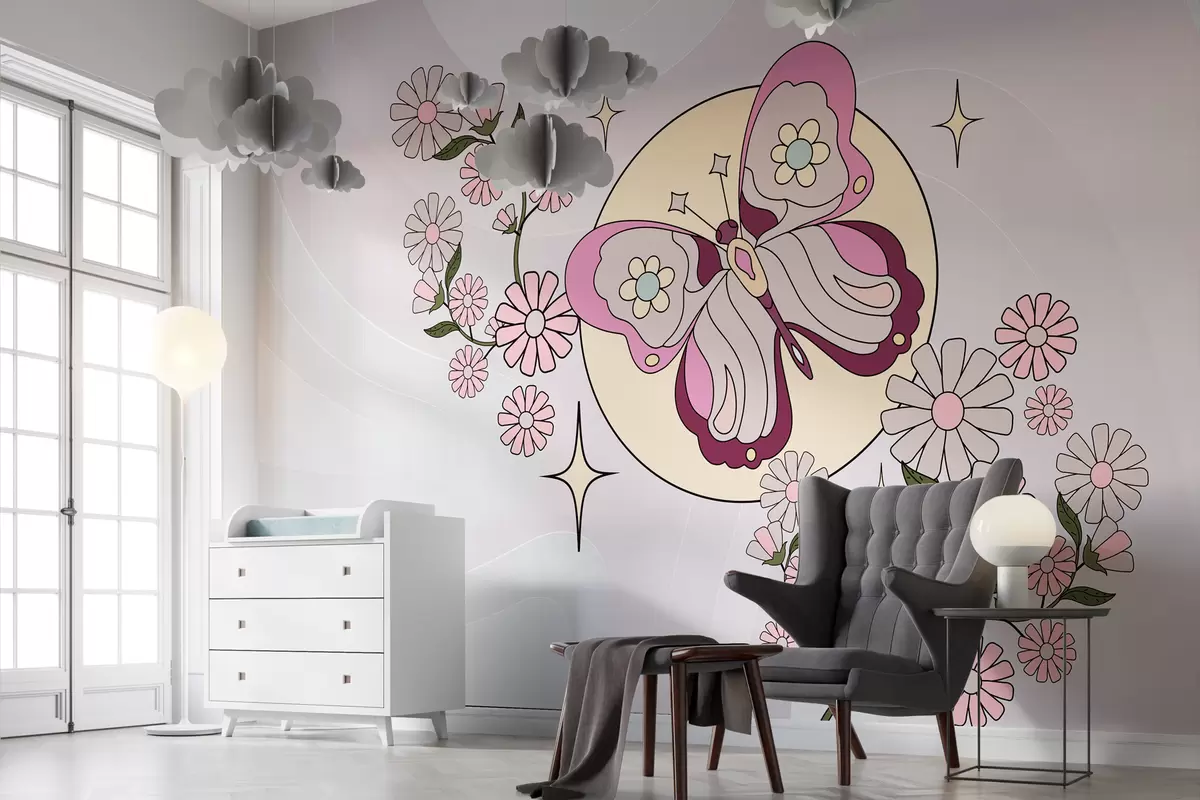 Fototapet tapeter med en rosa fjäril på en ljusgrå-rosa bakgrund bland blommor i en enkel stil för ett flickrum Nr. w00985