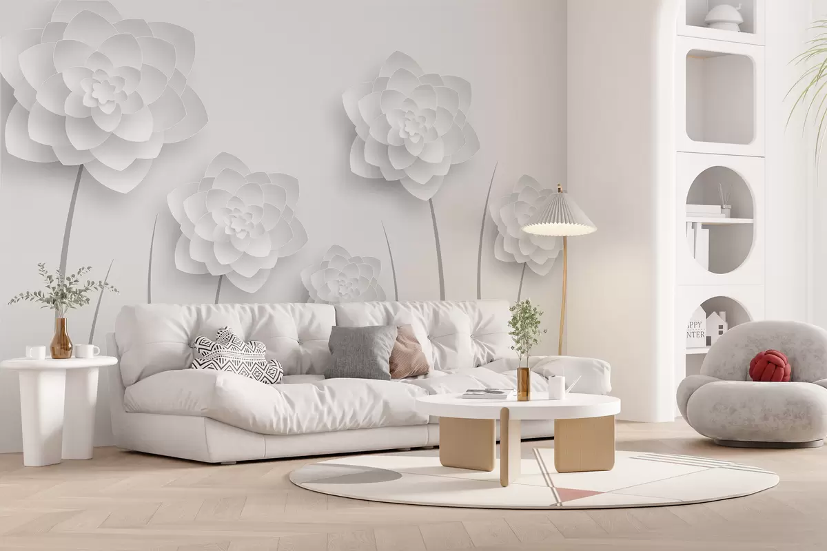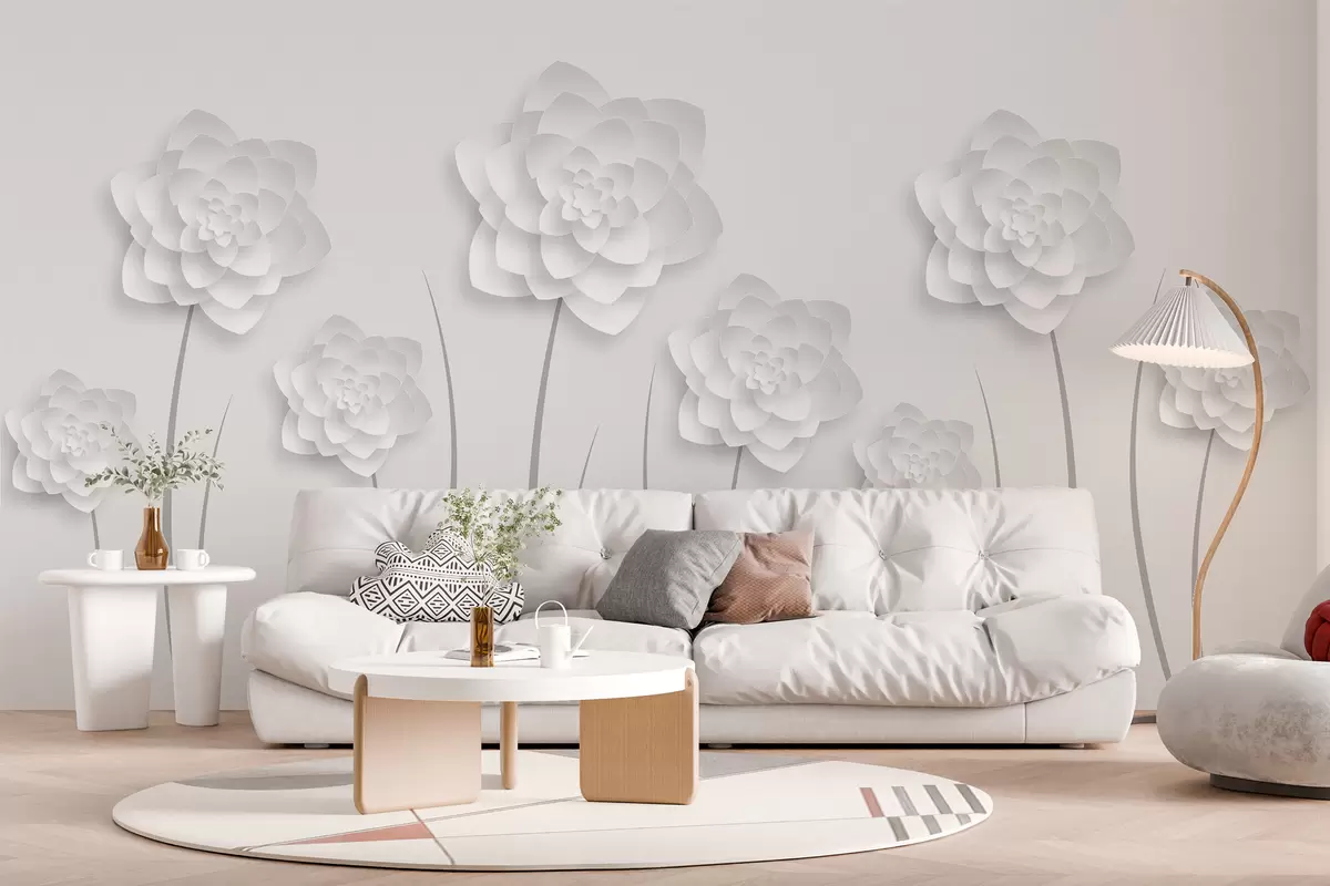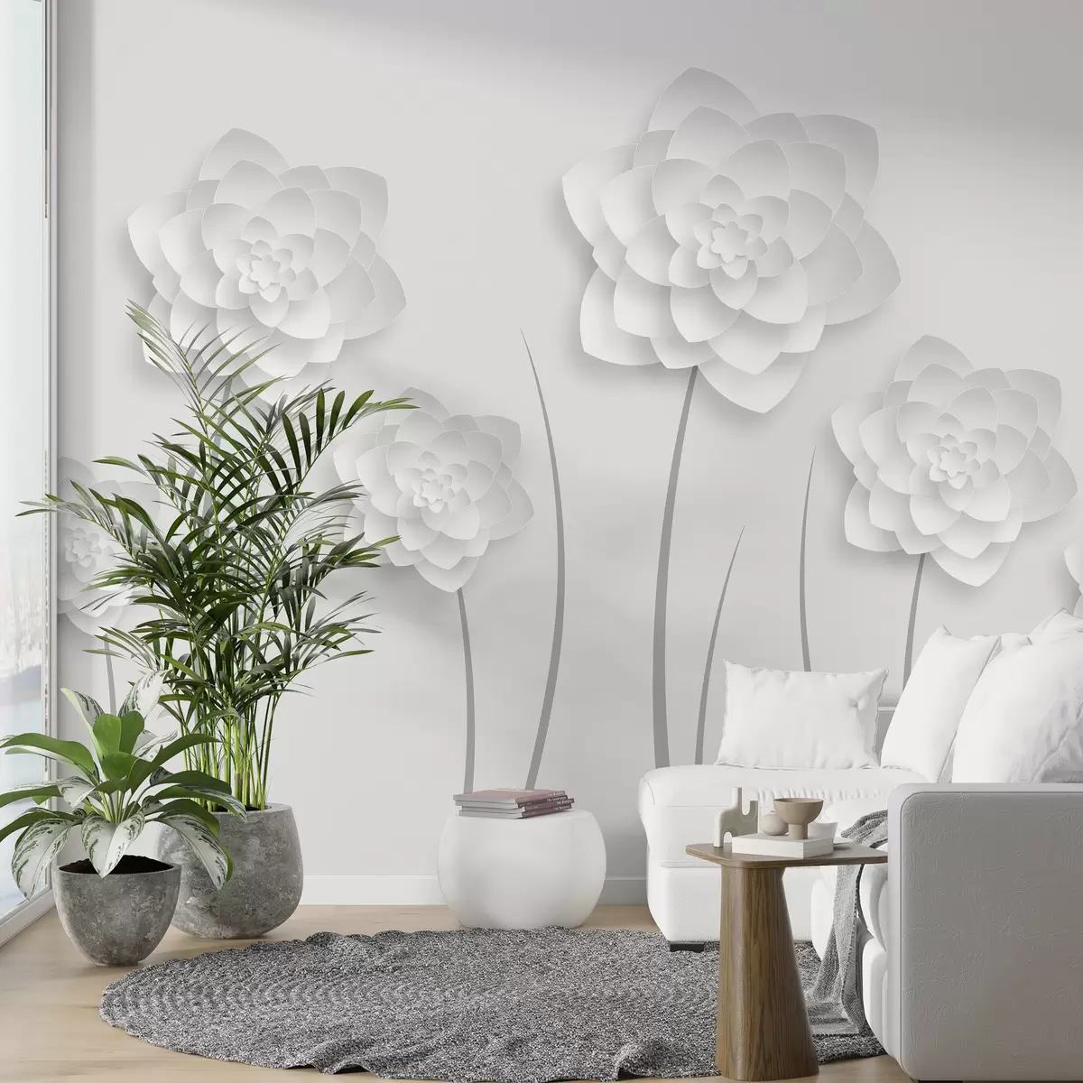 Fototapet Stora blommor med imitation av volym i pappersstil på en ljusgrå bakgrund med en grå stjälk Nr. w01021
