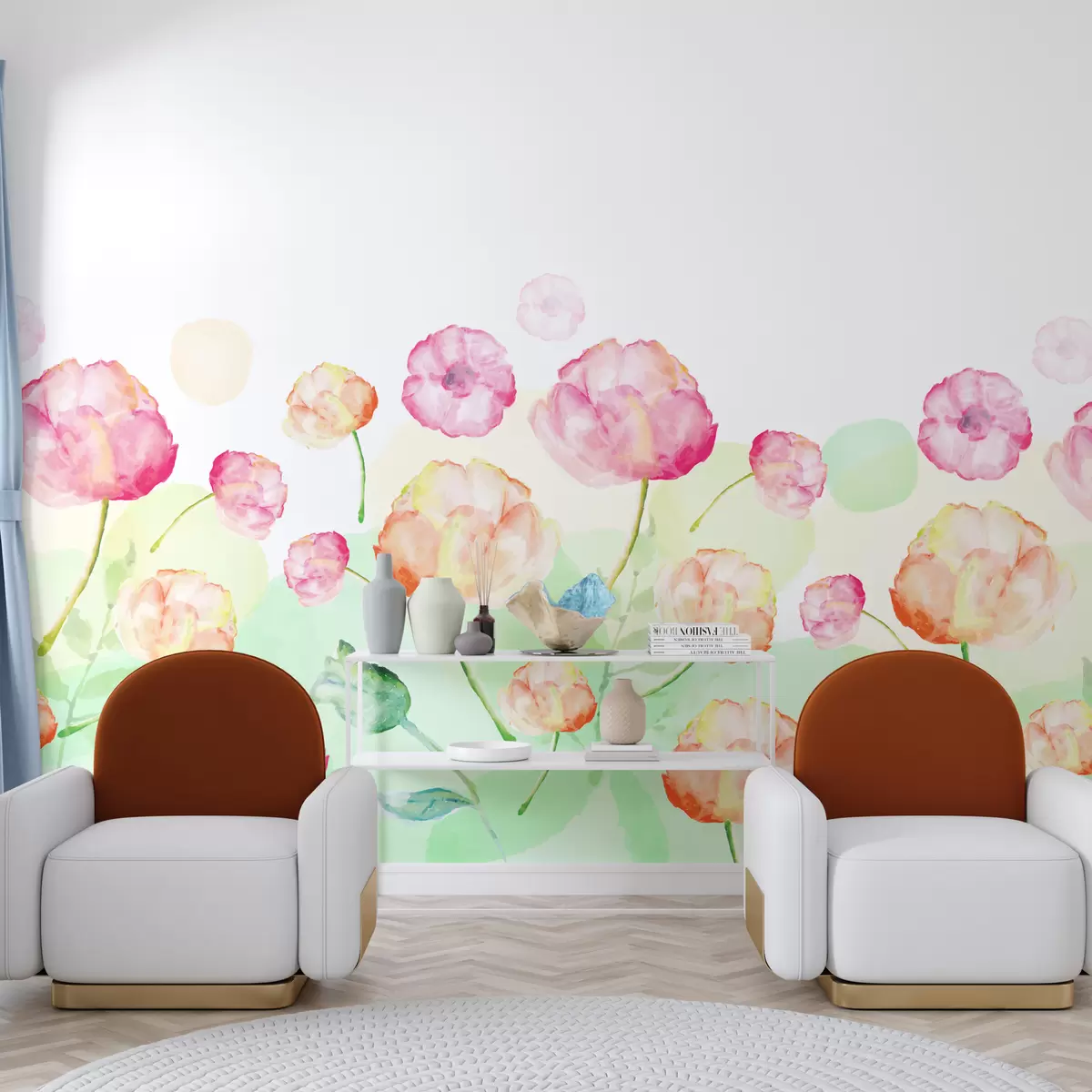 Fototapet röd-orange och rosa tulpaner i akvarellteknik på vit bakgrund med gröna fläckar w01028