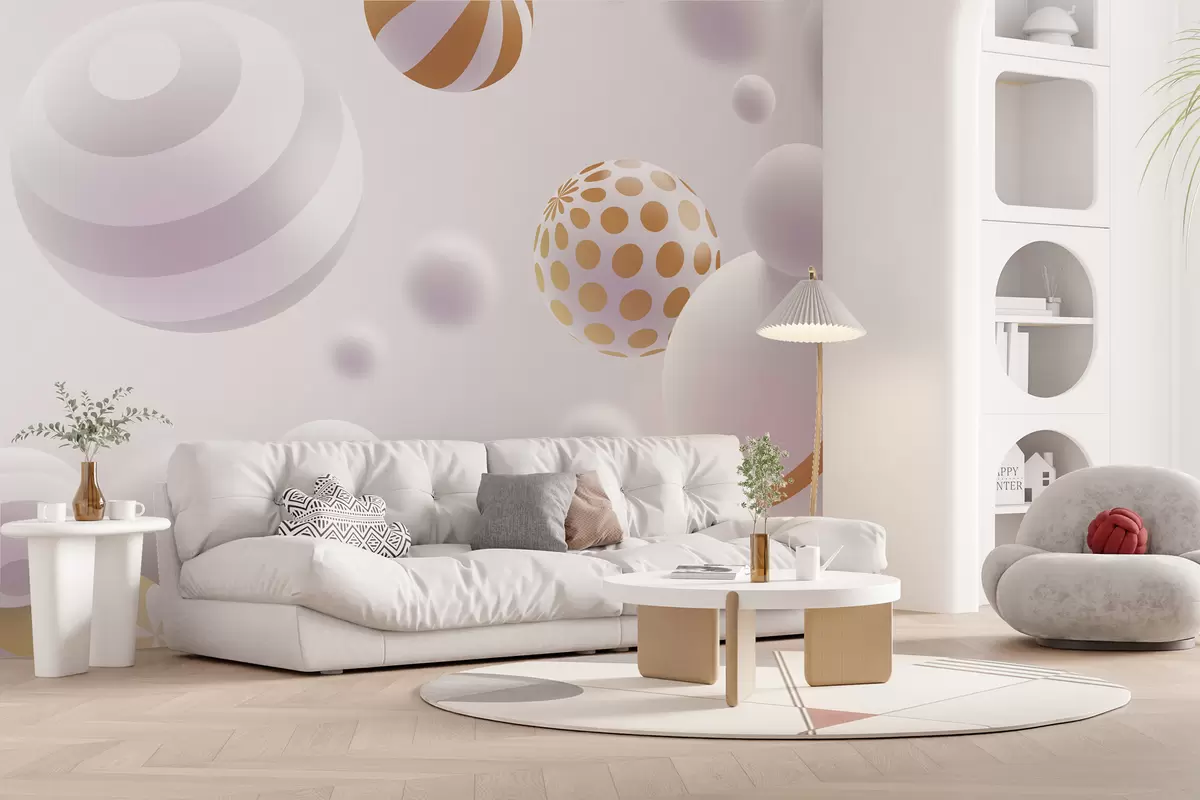 Fototapet Volymetriska flygande sfärer i 3D-stil i ljusgrå toner med orange accenter Nr. w01148