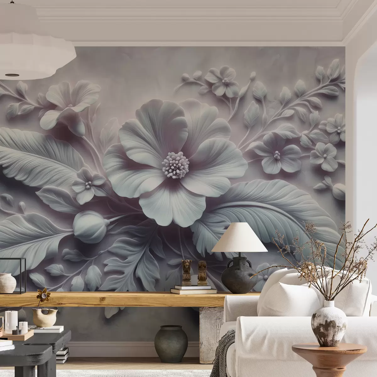 Fototapet 3D-reliefväggkonst med fjädrar och blommor, med en stor vallmo i ljusblå färger Nr. w01340v2