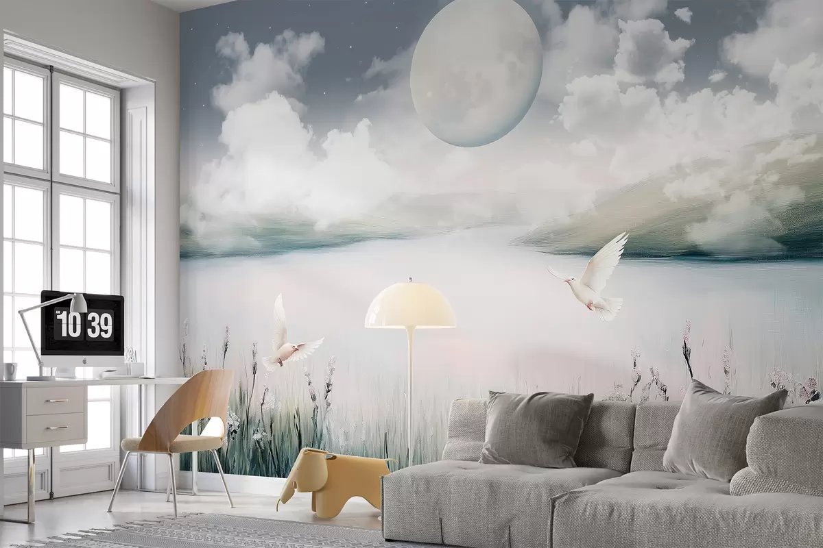 Fototapet Vackert landskap med sjö, blomsteräng, måne på nattstjärnhimlen, flygande fåglar, moln Nr. w01389
