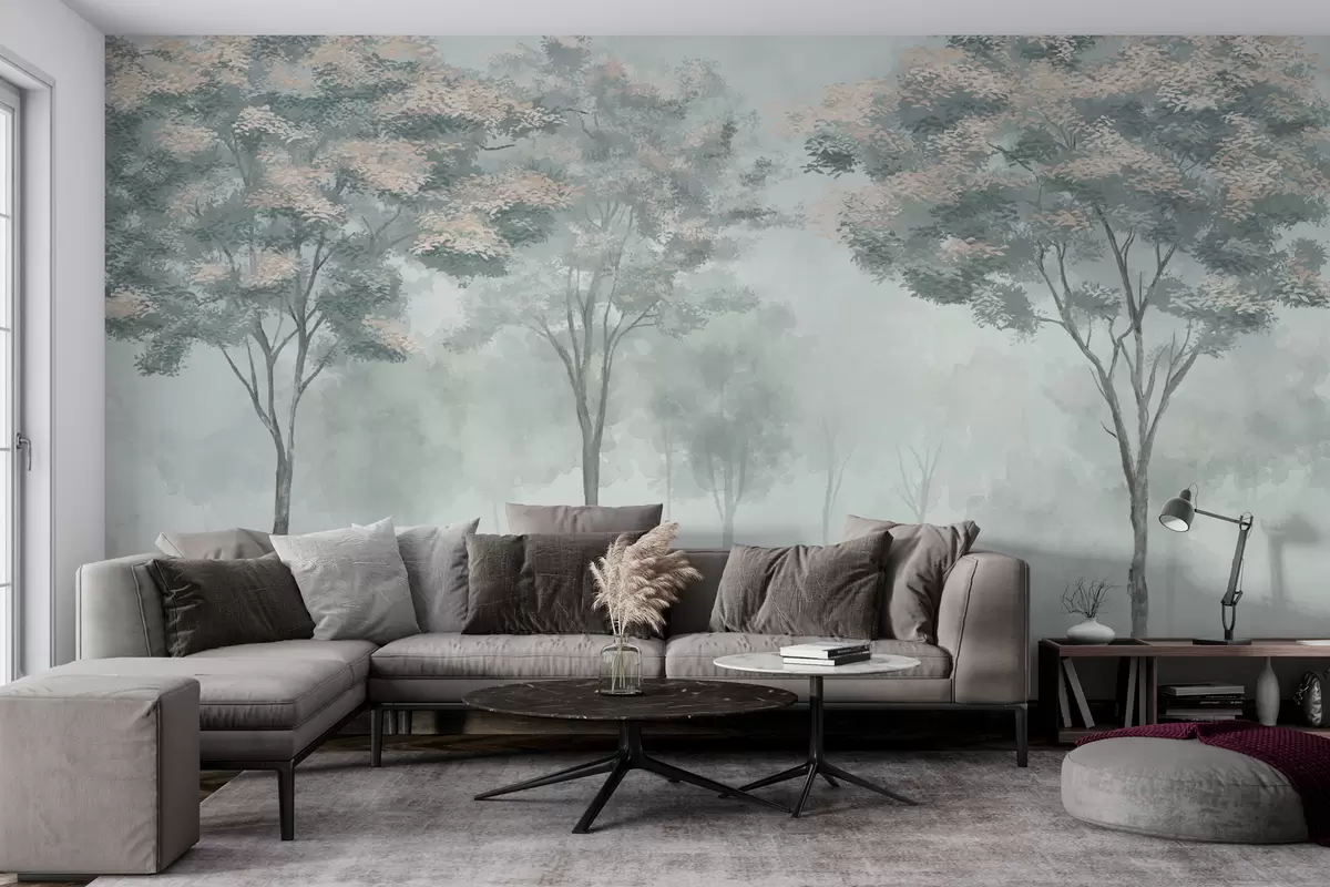 Fototapet Siluett av dimmig skog i färgerna grönt, ljusgrått och beige Nr. w01599