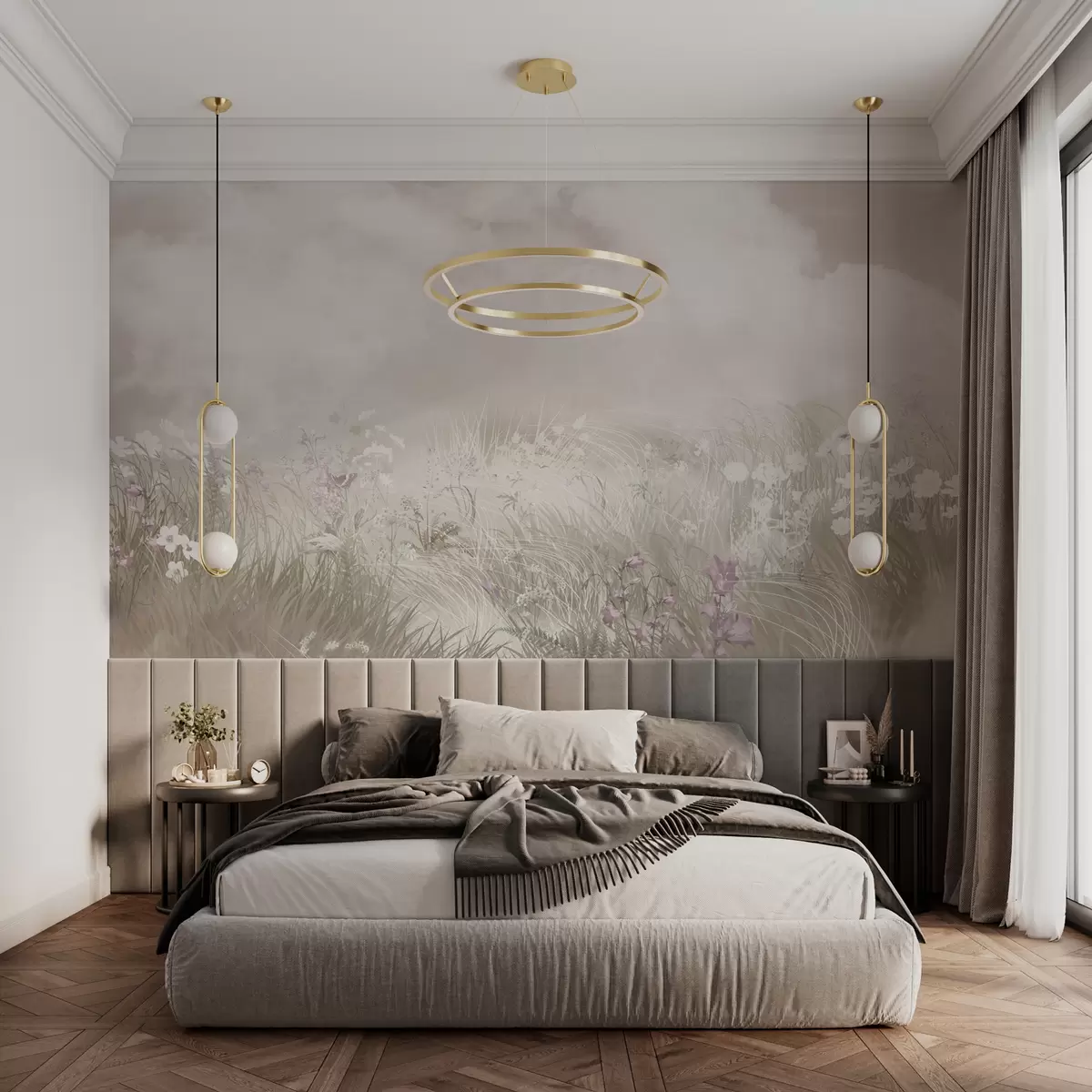 Fototapet Vildblommor och gräs med ljusrosa himmel och moln Nr. w01624v4