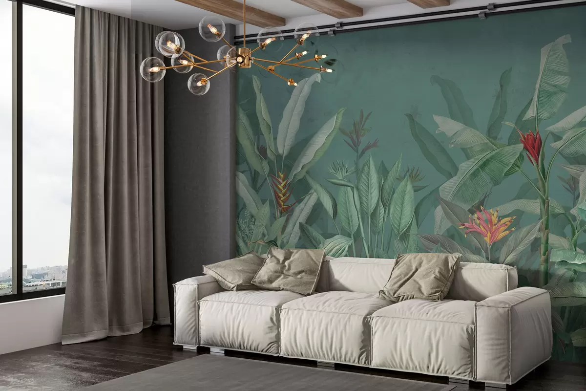 Fototapet Tropiska blad och blommor på en grön bakgrund Nr. w01834v2
